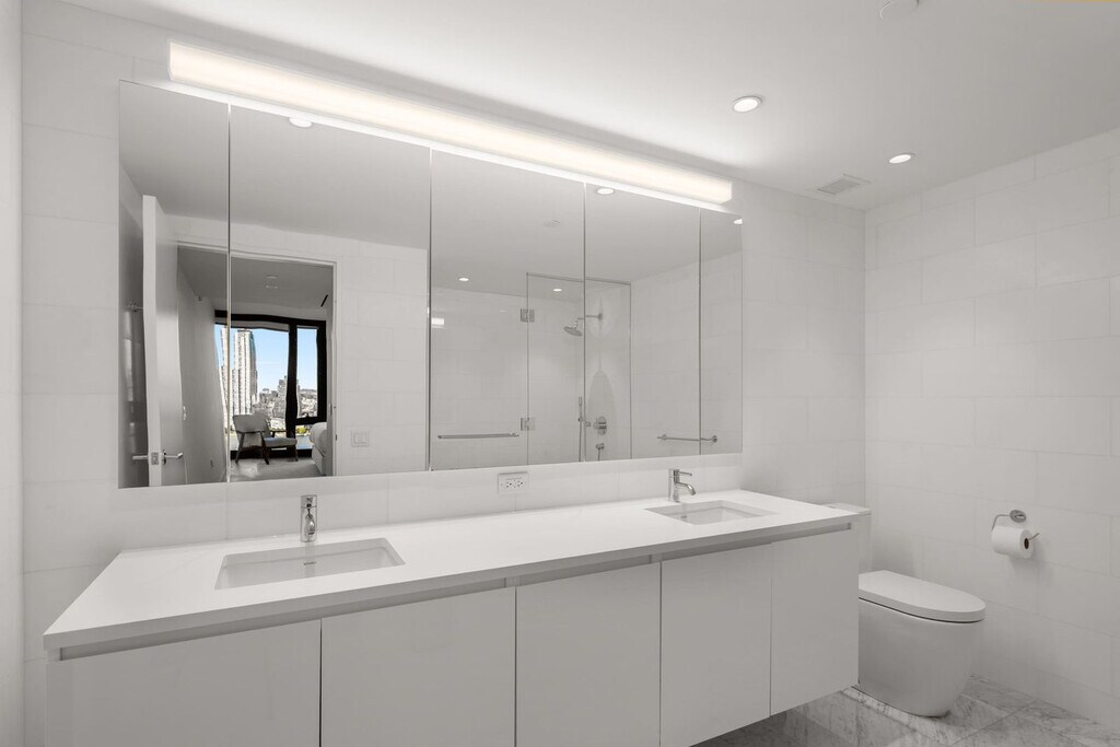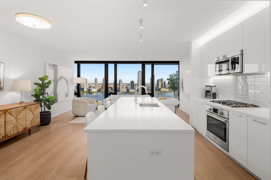 Welcome to this sun-drenched, 2-bedroom apartment on the 24th floor of a full-service luxury building, elevated above Manhattan and directly across the street from the United Nations headquarters. Feel at home in this sophisticated residence. From the moment you enter, natural light pours into the apartment through floor-to-ceiling windows, illuminating a spacious living and dining area with panoramic views of the East River. The living room features high ceilings, a full-size seating area with oversized furniture from brands including Restoration Hardware and Arhaus, and a dining table. The renovated kitchen features top-of-the-line appliances. This apartment also offers connected access to streaming services via a smart TV and blazing-fast Wi-Fi. Additional highlights include a full-size washer and dryer, hardwood flooring throughout, and abundant storage. Guests enjoy access to a tranquil indoor pool, modern fitness center, resident lounge, and 24-hour concierge service. Perfectly situated along 1st Avenue, this unit places you steps from the United Nations Headquarters, the East River, and the rest of midtown Manhattan. Excessive use of A/C (exceeding $250/mo) will be billed back to guests after move-out. The master bedroom offers an en-suite bathroom and workstation. [SI]