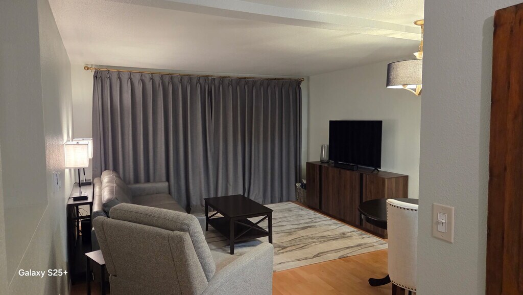 Modern and fully furnished 1-bedroom condo featuring an open layout, stylish lighting, and warm finishes throughout. The living room offers a comfortable sofa, TV, and dining area, while the kitchen includes stainless steel appliances, granite countertops, and plenty of storage. The bedroom provides a cozy retreat with a classic wood bed, plush bedding, and a spacious walk-in closet. Enjoy a clean tiled bathroom and a private balcony perfect for morning coffee or evening relaxation. Highlights: Fully furnished & move-in ready Washer/dryer in unit Private balcony Walk-in closet + additional storage Peaceful, well-kept community Ideal for professionals or travelers seeking comfort and convenience.