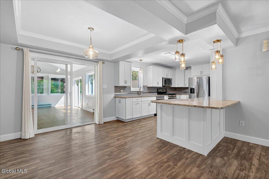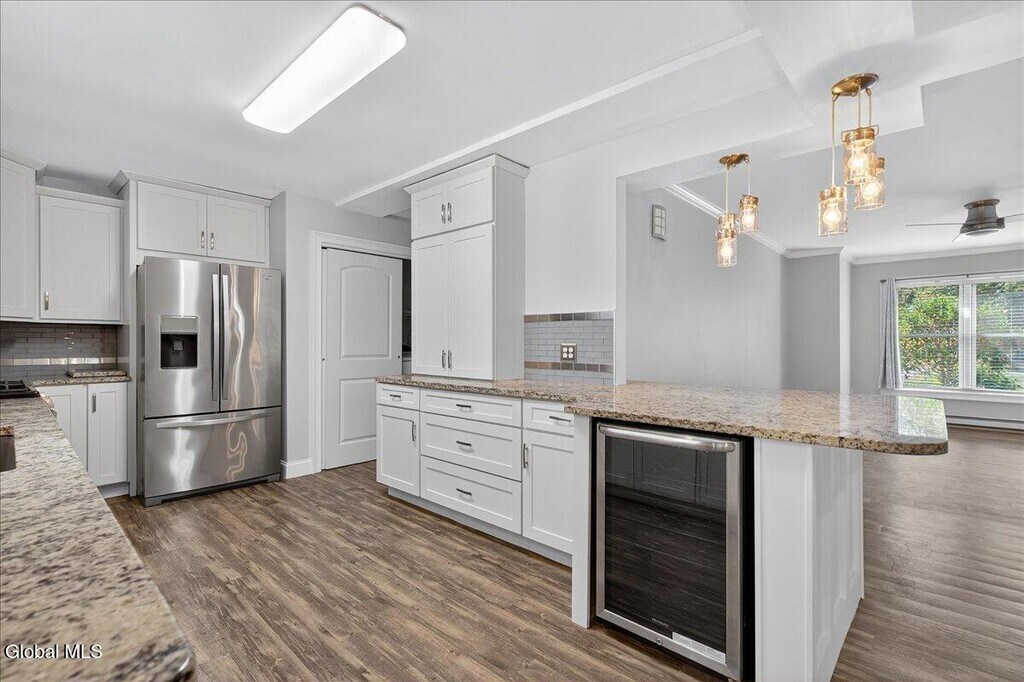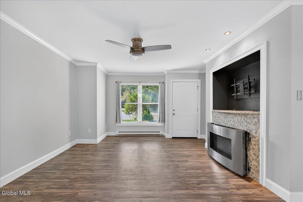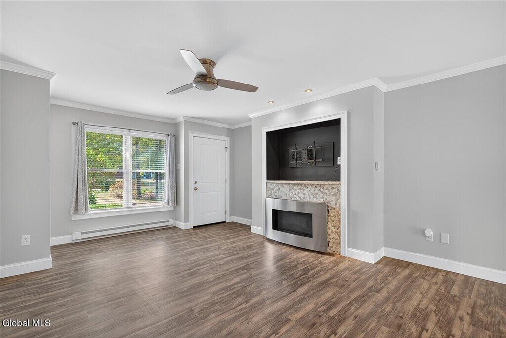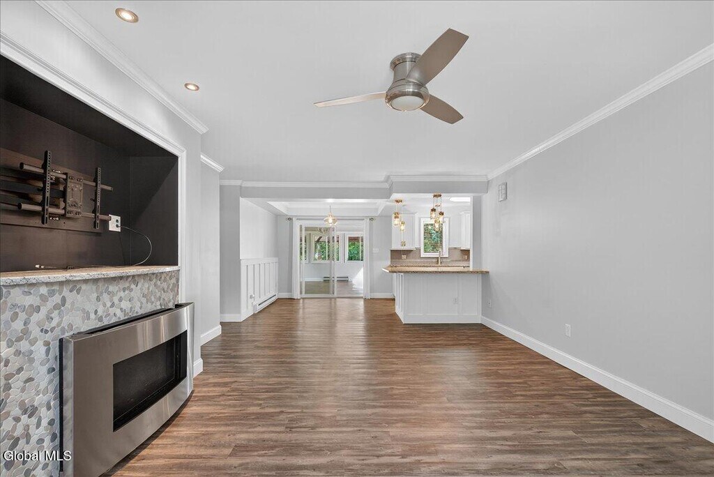 Stylish & Spacious (1267 sqft) 2-Bedroom 1 Bath Duplex with Sunroom, Garage & Luxury Finishes 7A James Ct, Gansevoort This fully renovated 2-bedroom, 1-bath duplex offers comfort, quality, and convenience in a quiet cul-de-sac within the highly regarded Schuylerville School District. Inside, enjoy a bright sunroom ideal for relaxing or working from home, elegant crown molding, and a cozy propane fireplace in the main living area. The modern kitchen features granite countertops, stainless steel appliances (brand new gas stove and dishwasher), a bar-top counter for casual dining, and a built-in beverage refrigerator. Additional highlights include an in-unit washer and dryer, new AC unit, attached 1-car garage, and off-street parking. Step outside to your own private patio surrounded by a beautifully landscaped yard and garden perfect for outdoor living. Just minutes to I-87, shopping, and Saratoga Springs.