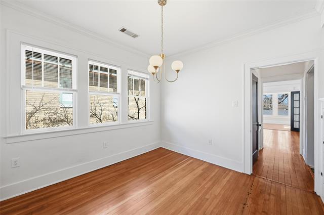 Beautifully updated apartment in a classic 1920s fourplex, blending timeless character with modern comfort. Original hardwood floors, doors, detailed moldings, and other period touches have been thoughtfully preserved, while fresh upgrades bring a clean, contemporary feel. If you love vintage pocket doors with beveled glass, classic door knobs, and timeless penny tile, this one is for you. Large, open rooms are filled with natural light, creating an airy and welcoming atmosphere throughout. The renovated kitchen features quartz countertops, brand-new stainless steel appliances—including refrigerator—along with all new lighting and plumbing fixtures. Fresh paint throughout enhances the home’s bright, move-in-ready appeal. Each unit includes a private utility room with washer and dryer, plus one assigned off-street parking space. Perfectly positioned overlooking Bishop Arts and the beautiful Kidd Springs neighborhood, this home offers classic charm, modern updates, and an unbeatable location. Landscaping is planned next and includes sitting areas and greenery.