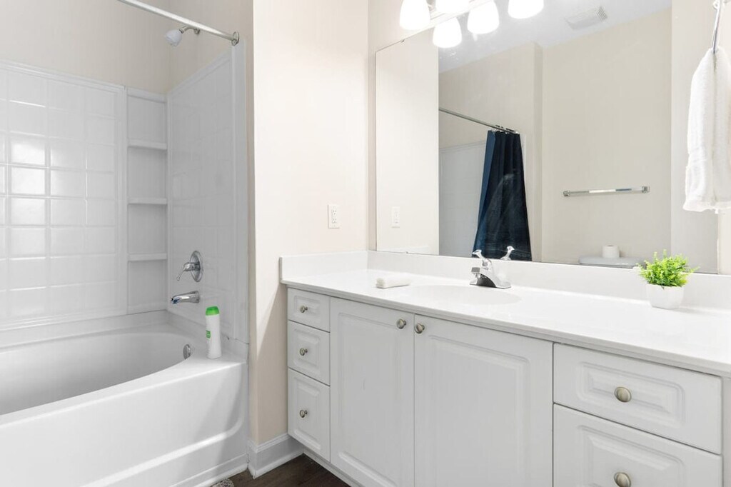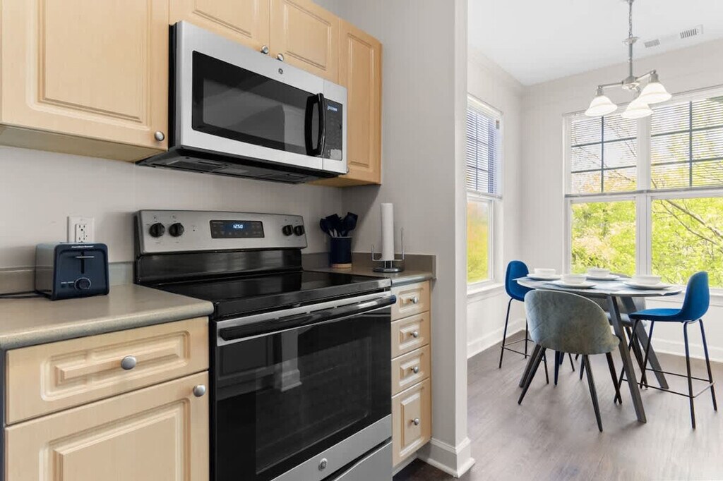 Stay in style in the eclectic city with this classy 902-square-foot 2-bedroom apartment featuring a king-size bed and two plush full-sized beds for your comfort. Enjoy lightning-fast Wi-Fi, a height-adjustable standing desk, a fully equipped kitchen, and other luxurious amenities specially designed for longer stays. Step out to a lively neighborhood, close to restaurants, cafés, bars, and shops. Begin your day with a perfectly brewed cup of tea or instant coffee—decaf or regular—prepared just the way you like it from the convenient coffee station in your upscale kitchen. Whether you're here for business or leisure, this space is designed to provide the perfect balance of comfort and convenience. With vibrant restaurants just minutes away, you might find yourself exploring the culinary scene in Cary each night. After a long day, it’s reassuring to know that your well-equipped kitchen and elegant dining table are ready to provide a 5-star dining experience right at home. Whether you choose to venture out or stay in, this space serves as the perfect home base for work, relaxation, and entertainment. Free on-site parking is available on a first-come, first-served basis. Public transit and ride shares like Uber and Lyft are easily accessible. We welcome up to two pets per reservation, each weighing under 35 lbs, with a fee of $49 per pet for stays of 1–6 nights. Additional charges apply for longer stays. For pets over 35 lbs, a one-time large pet fee applies. Bringing undisclosed pets into the unit may result in a minimum $500 fine and cancellation of your stay without refund. Optional mid-stay cleaning is available for $175, which includes new linens, surface cleaning, and trash removal. Situated in a vibrant neighborhood, this property places you within minutes of top attractions, dining, and nightlife. Enjoy easy access to Duke University, Sarah P. Duke Gardens, Nasher Museum of Art, Durham Performing Arts Center, American Tobacco Campus, Durham Bulls Athletic Park, Eno River State Park, Brightleaf Square, 21c Museum Hotel, and Hayti Heritage Center, all within a short drive. Quiet hours are strictly enforced from 8:00 PM to 8:00 AM. During this time, guests must keep noise to a minimum. This property is equipped with noise monitoring devices and exterior security cameras. If noise levels exceed 80 decibels for more than 10 consecutive minutes, guests will be fined $2,500, removed from the property immediately, and their reservation will be canceled without refund. Smoking is strictly prohibited anywhere on the premises. If a smoke detector is tampered with or triggered due to smoking, guests will be fined $2,500 and removed from the property immediately without refund. Unauthorized guests will result in a $500 fine per person, immediate removal from the property, and cancellation of the reservation without refund. Includes a dedicated work station with a standing desk, perfect for remote work, and fast Wi-Fi (300+ Mbps) ideal for streaming, remote work, or video calls. A laptop computer is not included. [SI]