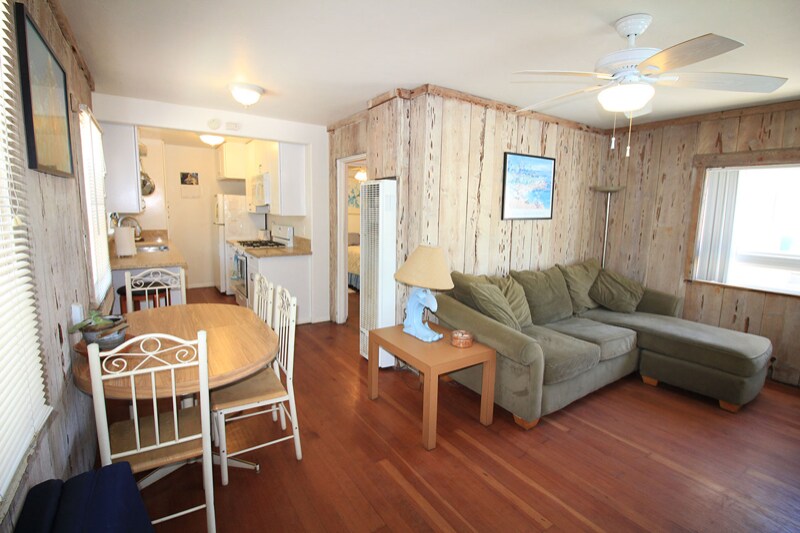 Property Id: 440991 Furnished. Rented by the Day (3 night minimum), Weekly, Monthly (9/5-5/27) Furnished. Available Starting 8/12 prorated on $10000/month for rest of summer and then to continue with off season rate $4400/month starting 9/4 1 BEDROOM, 1 BATH COTTAGE This is a classic-style 1 bedroom, 1 bath original Mission Beach Cottage with fabulous view. Comes equipped with refinished original Hardwood floors throughout, cedar paneling highlights its rustic, wood-accented interior. Amenities include Full kitchen with dishwasher, microwave, oven and stove, refrigerator, pots, pans, plates, utensils, glasses, etc., 1 GBPS Fiber WIFI Internet, Direct TV Cable, flatscreen TV in Living room and in bedroom, washer/dryer in laundry room, patio with BBQ and a large reserved parking space. It is a few steps from the ocean, 1 block to bay.