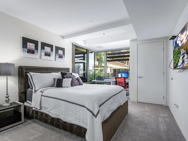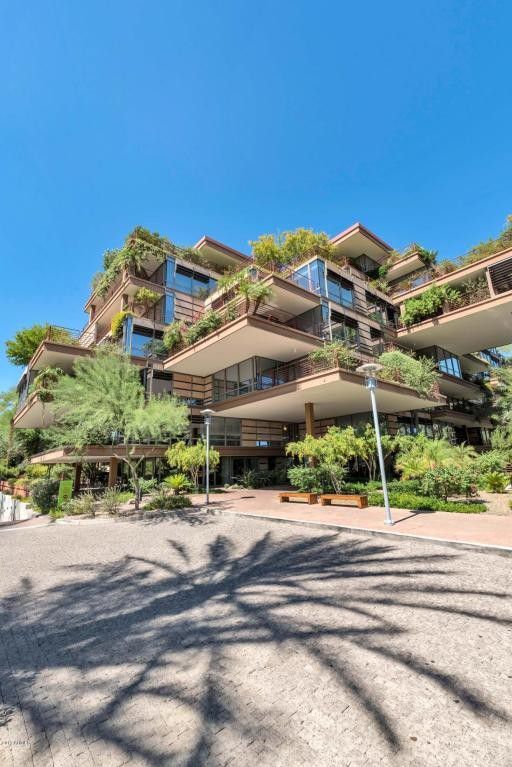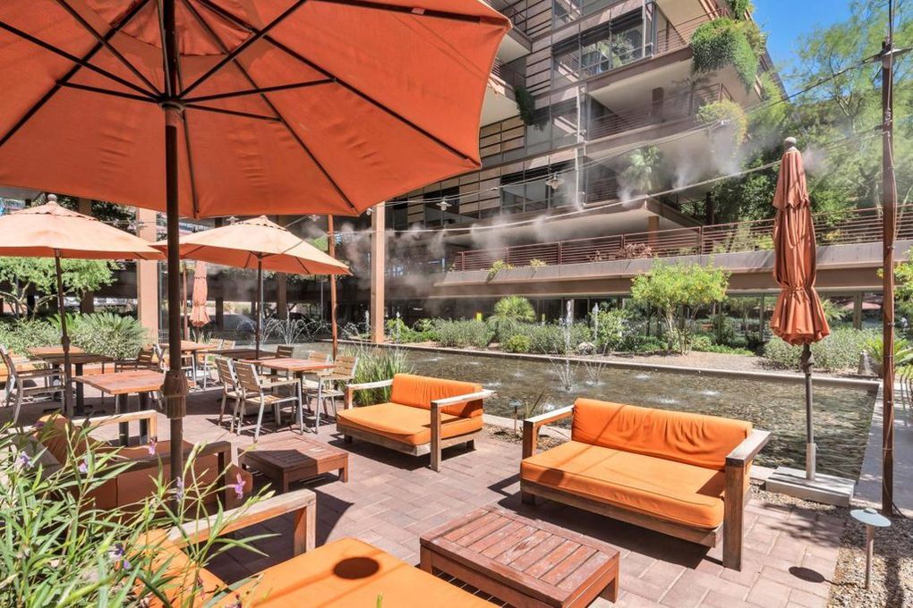 Fully furnished & available 5/30/2026. Discover this VERY RARE 2 Bedroom/2 Bath CORNER UNIT with 2 assigned parking spots and extra large, private garden terrace in award-winning Optima Camelview Village. Floor-to-ceiling windows wrap around the unit, filling every room with natural light and offering open views of the lush promenade and waterfalls. Entertain or relax on the expansive, coveted private garden terrace—perfect for al fresco dining to the soothing sound of the fountains. Inside, enjoy modern and comfortable décor, a dining area for six, a bar station, fully stocked kitchen, five leather recliners, and XL smart TVs in every room (including a unique swivel TV for flexible viewing on the patio). The Master suite boasts a walk-in in closet, premium luxury mattress and the perfect orientation for light sensitive sleepers. Enjoy resort-style amenities including 24/7 concierge, heated indoor and outdoor pools and spas, state-of-the-art fitness center, racquetball and basketball courts, putting green, on-site restaurant, dry cleaner, business center, and 24/7 onsite security. Located just steps from Fashion Square Mall, Scottsdale's top restaurants, theaters, and entertainment. This rare corner unit offers the ultimate blend of luxury, convenience, and vibrant Scottsdale living—available 9/1