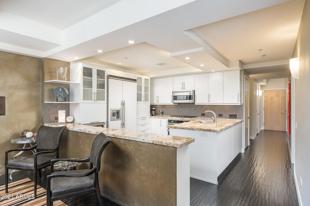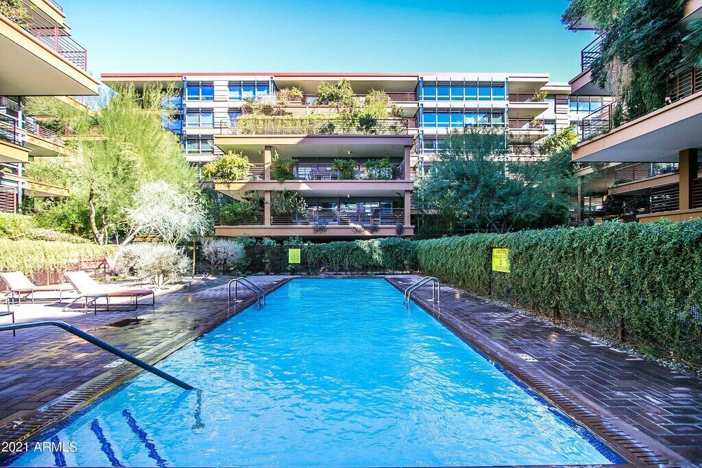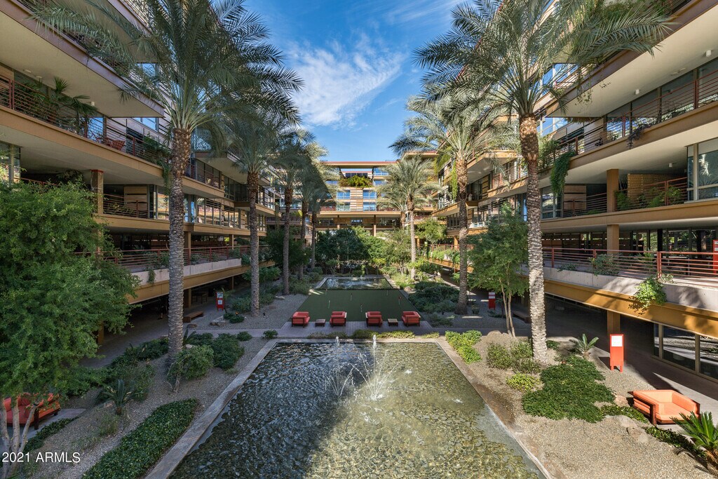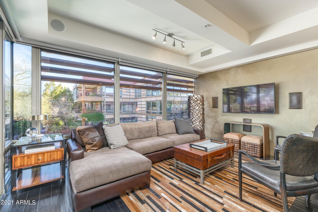 GORGEOUS Luxury condo,views on the 6th floor in the heart of Scottsdale's Entertainment District. 3 month minimum Optima Camelview. Fully interior designed furnishings including Linens,Barware. All you need is your suitcase! Walls of glass,1 BR + plus open optional den/office area features a custom built in Murphy Bed for guests or use as office. Walk across to Fashion Square Mall,Harkins Theatre,Ocean44,Nobu,Francine,Toca Madera upscale restaurants. Old Town,Art Galleries etc. No need to drive! Rarely available 6th floor. Abundance of Storage! Hardwood flooring thruout,Travertine Tile in both Bathrooms. Interior designed. Viking chef's kitchen. Auto remote Blinds. Golf putting green,2 outdoor pools,+ huge indoor pool/spas,locker/steam sauna,GYM,Basketball/Racquetball. 10+