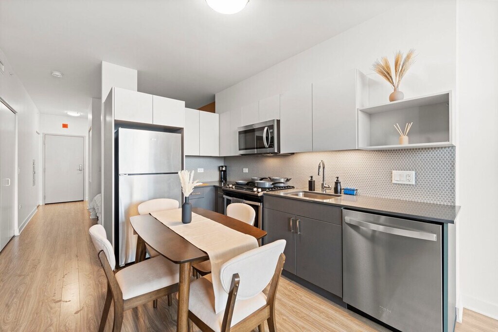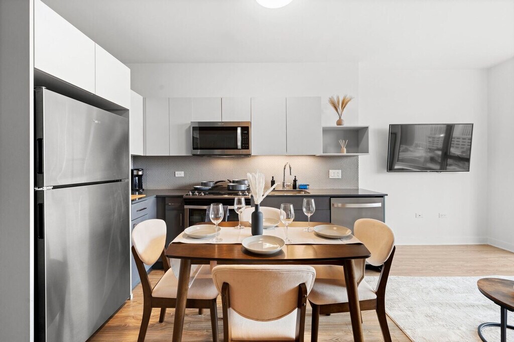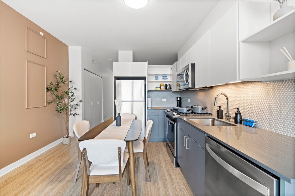 Experience luxury living in the heart of the city with this penthouse apartment, boasting modern interior design and breathtaking views of both the city and the lake. Situated in a peaceful neighborhood, this home offers proximity to grocery stores and top-notch restaurants, along with a 24/7 concierge service to ensure you feel at home. Located on the penthouse floor, this apartment provides stunning views and is equipped with cutting-edge kitchen appliances, an in-unit washer and dryer, fast Wi-Fi, and a smart TV, making it perfect for long-term stays. The building features a parking garage attached for easy access, with elevators taking you directly to your floor. Parking is available at $350 per month, reflecting the average rate for downtown Chicago. Nestled in a tranquil neighborhood, this apartment offers easy access to grocery stores and some of the city's finest restaurants, ensuring convenience and a vibrant lifestyle. Enjoy the array of grade A amenities including a swimming pool, rooftop deck, full-size gym, indoor fireplace, pool table, music studio, and game room, all designed to enhance your living experience. The building offers work-from-home rooms, providing an ideal environment for remote work with fast Wi-Fi and a peaceful setting. [SI]