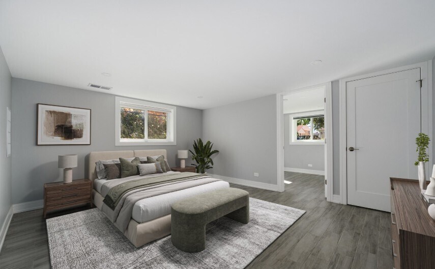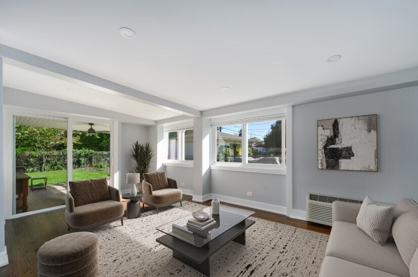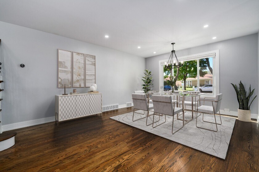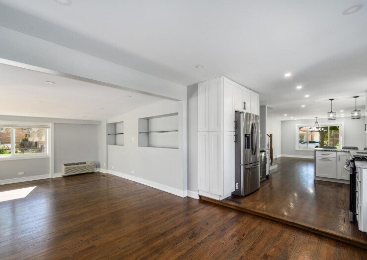 Lincolnwood - 4 Bedroom 2 1\2 Bath 2 Car Garage Welcome to this bright modern home with plenty of green space and amenities for comfortable living and entertaining life's precious moments. Enter your new forever home direct from the indoor garage parking and the chef's kitchen awaits your groceries. This large open kitchen welcomes northern and views of the tree lined street. With granite counter tops for easy maintenance after preparing a snack or feast which will be convenient. The kitchen is set up well with an abundance of stainless steel appliances. Enjoy your extra large refrigerator, a wine cooler, dishwasher and garbage disposal within the updated kitchen. The huge living space has a delightful western facing living room with hardwood floors and a half bathroom tastefully next to the front door. Hardwood floors are throughout the living spaces in a darker wood to compliment the freshly painted home. The three updated bedrooms on the first floor all have large