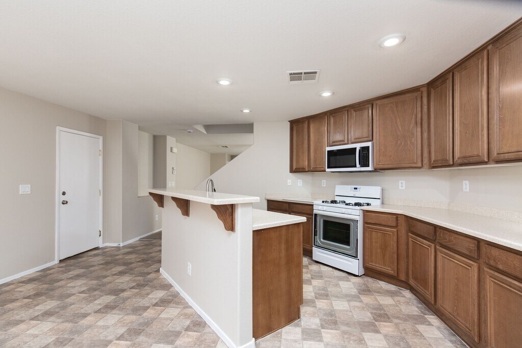 Introducing a charming 3-bedroom, 2.5-bathroom house located in fast growing Southwest Las Vegas. This home features an island kitchen perfect for entertaining, a convenient breakfast bar for quick meals, and an upstairs laundry room for added convenience. Enjoy the outdoors on the rear patio, ideal for relaxing or hosting gatherings. The spacious master bedroom offers a peaceful retreat at the end of the day. Don't miss out on the opportunity to make this house your new home.