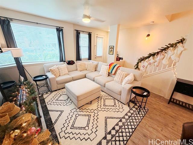 Welcome home to Kahiku at Mehana in Kapolei! This beautifully upgraded 2-bedroom, 2.5-bath townhome features an open floor plan that flows seamlessly to a private, landscaped yardperfect for relaxing or hosting BBQs. Enjoy modern touches throughout, including luxury vinyl plank flooring, split A/C units, and a spacious primary suite with dual vanities and a walk-in closet. The home also includes a detached garage plus an additional open parking stall for added convenience. Kahiku at Mehana is a pet-friendly community offering access to exclusive amenities such as a pool, BBQ area, clubhouse, jogging paths, and multiple parks. Conveniently located near freeway access, beaches, and the shopping, dining, and entertainment of Kapolei and Ko Olina, this townhome combines comfort, style, and the best of island living.