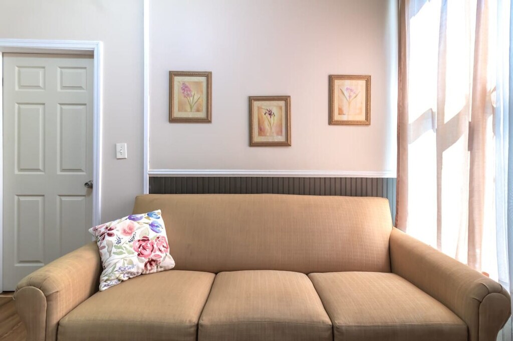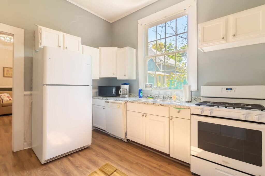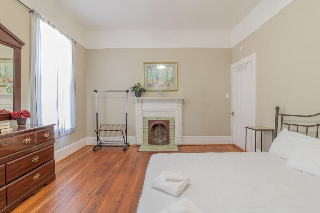 This charming getaway is the back unit of a duplex, nestled in the heart of Columbus yet secluded from the hustle and bustle of downtown. Relax on the back porch or soak up the natural light flooding the apartment. It is just a short walk from downtown and 15 minutes to Fort Moore. The fireplaces, while no longer functional, add to the historic character of this lovely home. This 2-bedroom, 1.5-bathroom home sleeps 7 and is the perfect place to escape. The beautiful heart-pine floors have been refinished, and the windows let in plenty of light. Enjoy cooking in the fully stocked kitchen and gathering around the TV in the living room. During your stay, you will have full access to the back unit, while the front unit is rented separately. A pack 'n play or travel crib is available upon request. Pets are welcome with a non-refundable pet fee. Pets must be crated when left unattended, are not allowed on furniture or beds, and all waste must be cleaned up from the yard. If there is evidence of pet hair on the furniture, excess hair in the home, stains, or waste found in the yard or home, you will be charged the cost to clean this. You will love this quiet street right next to downtown restaurants, bars, and the riverwalk. All downtown attractions are within walking distance, and Fort Moore is just a short drive away. You can walk to everything downtown, and the post is just a short drive or Uber away. Guests must be at least 21 years of age to rent this property. Smoking is prohibited, and if any signs of smoking are found, an automatic $500 damage charge will be incurred. Parties are not allowed, and quiet hours are between 10 PM and 7 AM. If quiet hours are violated, the reservation may be canceled without a refund. Damage to the home or its furnishings during your stay will be your responsibility. Trash must be bagged and placed in the bins provided, with a $100 charge for excessive trash removal. Registration Number: STVR-11-23-7559 [SI]