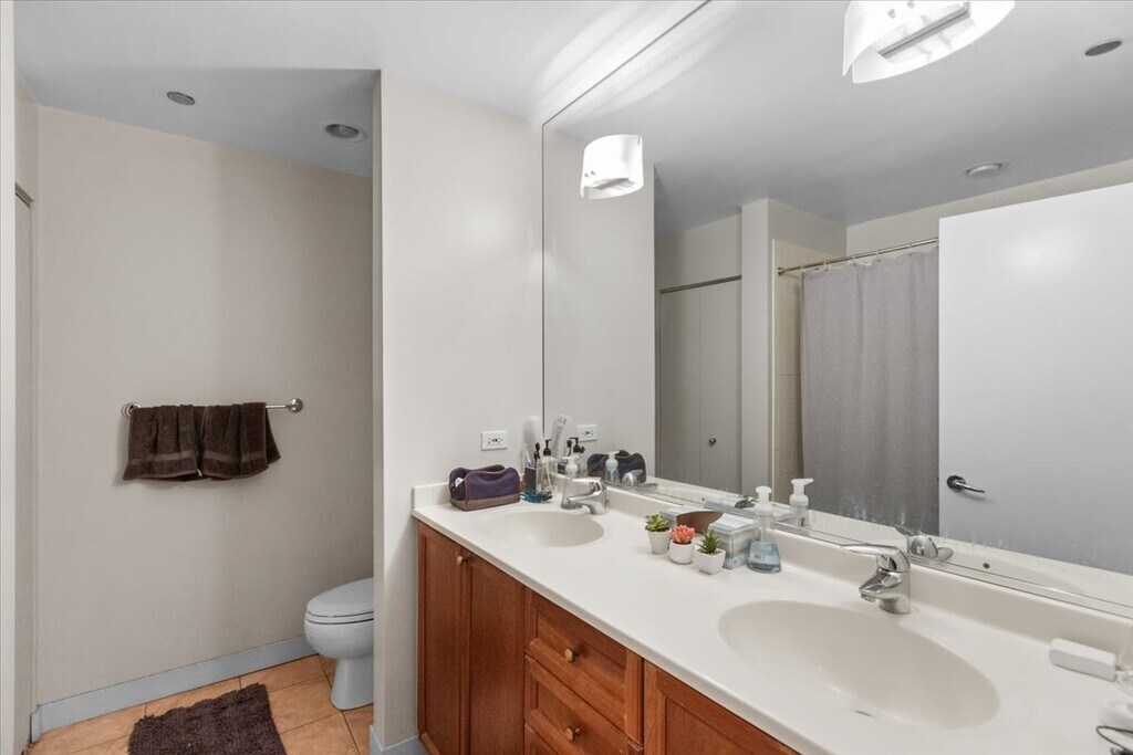 Elevate your lifestyle in this radiant and expansive southeast corner haven, a 2-bed/2-bath masterpiece within the iconic Skybridge building. Marvel at breathtaking panoramas of the Chicago skyline, setting the stage for a living experience where every element of comfort is effortlessly curated within the premises or just steps away. Indulge in the luxury of a thoughtfully designed split floor plan, ensuring privacy for the dedicated primary suite, strategically distanced from the common areas and the second bedroom. The primary bedroom, generously proportioned, accommodates not only rest but also a space for a cozy home office. A walk-in closet, meticulously crafted with custom shelving, complements the lavish primary bathroom featuring a separate shower and a sumptuous soaking tub. Step into the communal space with an open layout that seamlessly integrates a kitchen adorned with 42" cabinets, pristine Calacatta Roma countertops, and a stylish bar with room for four barstools. The combined dining room and living room boast new hardwood floors and a contemporary light fixture, creating a perfect harmony of form and function. The second bedroom, offering expansive southern views, is generously sized and comes with large professionally organized closets. Convenience meets luxury with in-unit laundry, ensuring your daily routines are seamlessly integrated. This full-amenity building is a testament to a lifestyle of opulence, offering a 24/7 door person, on-site dry cleaner, a well-lit and top-tier fitness center, a rooftop terrace with panoramic vistas, a dog run, and a secure bike room. Your belongings find a home in the included storage locker, completing the package of a truly elevated living experience.