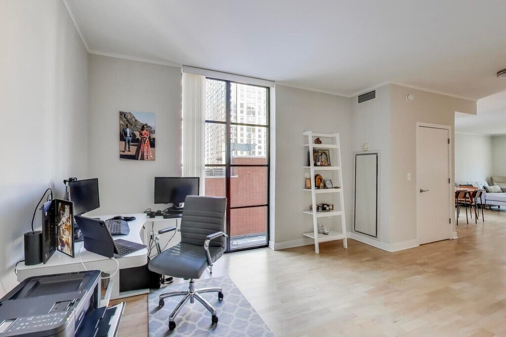 Spanning approximately 1,430 square feet,this expansive corner 2-bedroom PLUS large den,2-bath residence is ideally located in the heart of River North,just steps from top restaurants,shopping,fitness studios,and public transit. The bright,open living and dining area features a gas fireplace and flows into a well-appointed kitchen with granite countertops and stainless steel appliances. The east-facing primary suite offers floor-to-ceiling windows,a walk-in closet,and an ensuite bath with dual vanities and a jetted soaking tub,while the oversized den provides the perfect space for a home office,media room,or additional entertaining area. Enjoy morning light from the private balcony with room for seating and a grill,along with the convenience of in-unit laundry,central heat and air,and heated garage parking. Rent includes heat,water,cable TV,internet,and parking. Pets welcome. Available March 1 MLS# MRD12546954 Based on information submitted to the MLS GRID as of [see last changed date above]. All data is obtained from various sources and may not have been verified by broker or MLS GRID. Supplied Open House Information is subject to change without notice. All information should be independently reviewed and verified for accuracy. Properties may or may not be listed by the office/agent presenting the information. Some IDX listings have been excluded from this website. Prices displayed on all Sold listings are the Last Known Listing Price and may not be the actual selling price.