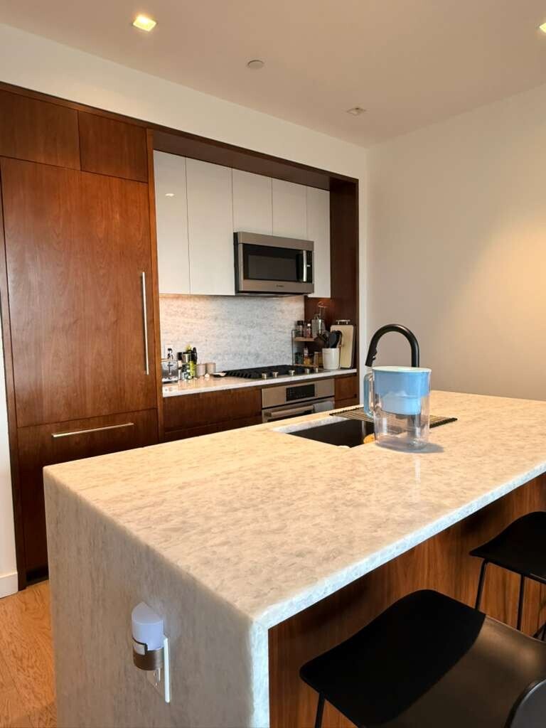 75 Park Lane South, residence 1510 is a south facing 1B1B with 713 square feet of living space. This Home has great exposure to natural light & partial NYC view and features an elegant chef’s kitchens with Bosch appliance package, undermount stainless steel sink, Madreperola Quartzite waterfall island and countertop. This home includes 2 good size closet spaces for storage. Park & Shore offers 20,000 square feet of amenities which include an indoor heated lap pool, fitness center, complete with yoga room, teak-line Spa, and steam rooms, wine tasting lounge with a private dining room, a co-working space, private conference room, putting green set against panoramic views of Midtown Manhattan and Newport Green Park, sky lounge, a landscaped rooftop lounge and dining area with a full prep kitchen, and a multi- media room. Located near PATH, Light Rail, shopping, restaurants and a beautiful park adjacent to the Hudson River waterfront in Jersey City’s vibrant Newport neighborhood. Parking is available for an additional fee.