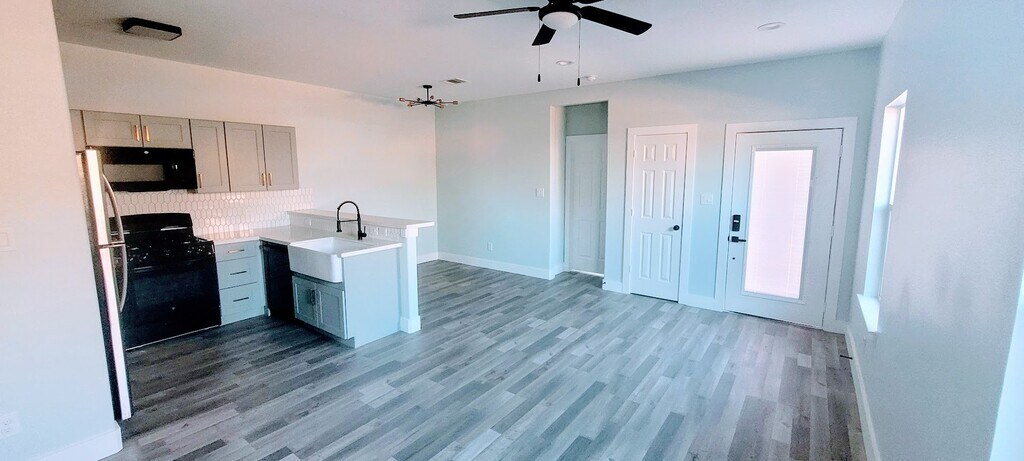 Stunning newly constructed home now available for lease. This charming single-story, 3-bedroom residence is situated within a duplex, offering a convenient location with effortless access to major routes such as 45 and 610, as well as downtown and beyond. Key highlights of this home include an inviting open-concept layout, durable vinyl plank flooring throughout, stylish quartz countertops, a generously sized walk-in pantry, modern recessed lighting, ceiling fans in every room, and upscale contemporary designer touches. For added convenience, a refrigerator is provided. Outside, enjoy the convenience of a double-wide driveway providing ample parking space and a spacious fenced backyard perfect for outdoor enjoyment.