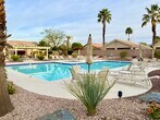 Located in Sun City Palm Desert, a 55+ Senior community association. This 1,110 sq. ft. home has been freshly painted with new flooring. There are 2 bedrooms and 2 bathrooms. The kitchen has a breakfast area with direct access to a private yard with grassy area and covered back patio. The homes in this section have their own pool and spa and are entitled to use all the other clubhouses and amenities in the complex. This area also has a direct cart entrance into the local shopping center parking lot and is close to convenient resident entrance gate. Wi-Fi and cable package included. Sun City is a gated community with 2 golf courses, 3 club houses, several pools and spas, 2 fitness centers, softball field, restaurants, postal center, dance studio, banquet facilities, tennis, pickle ball, bocci ball, and so much more.