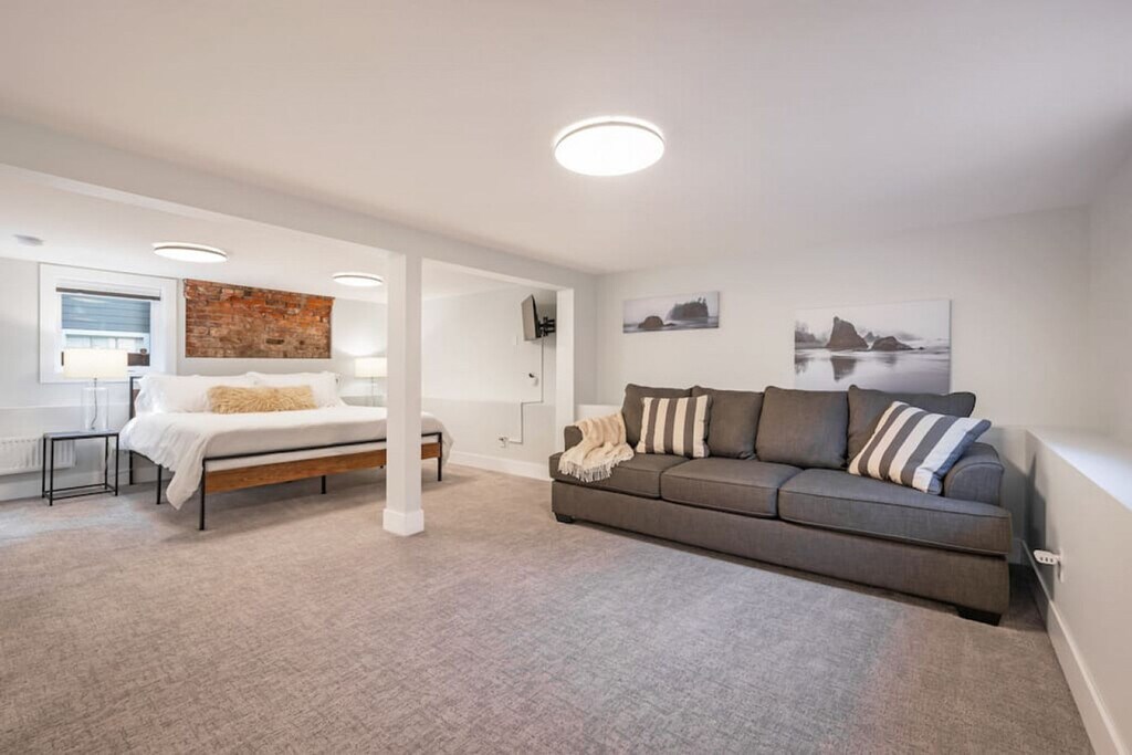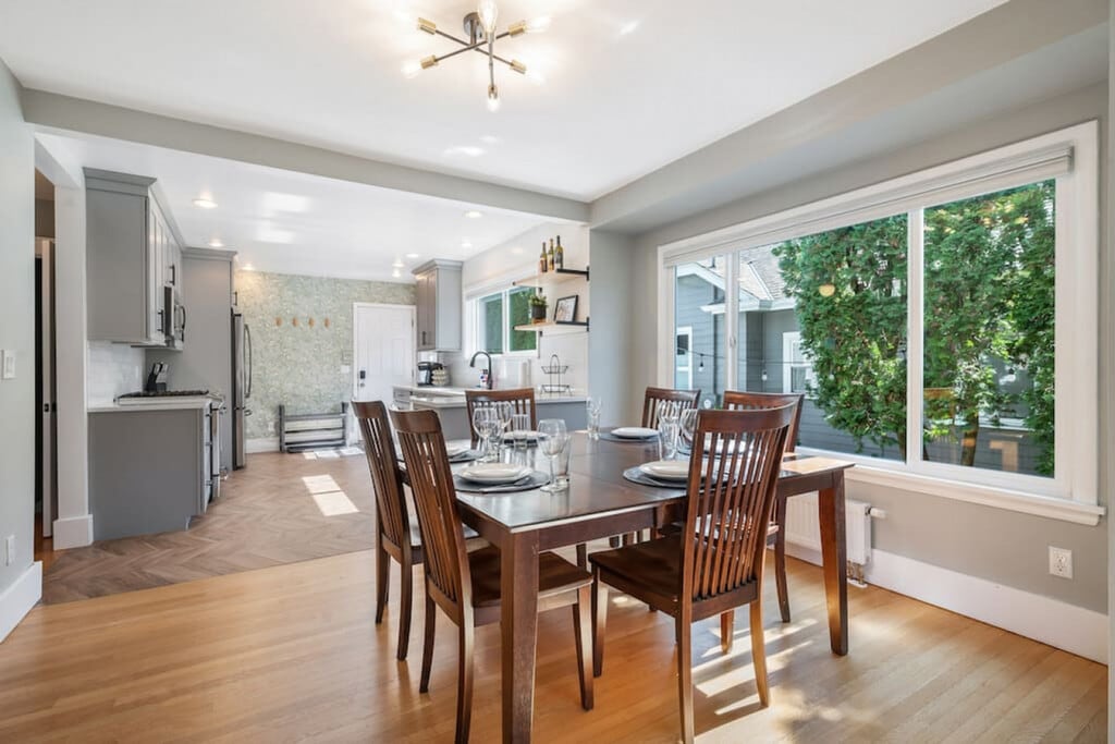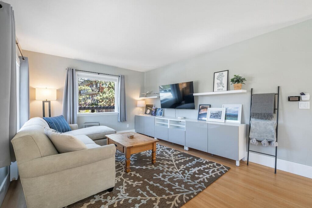 Welcome to your stylish getaway at this stunning 3-bedroom and 2-bathroom home located just a short walk from the picturesque Green Lake. Whether you're looking to explore Seattle's attractions, sample local cuisine, or enjoy entertainment venues, this home provides the perfect starting point for your adventures. Feel at home in the charming living area, where modern decor blends seamlessly with a fully equipped kitchen and cozy dining area. Relax in the spacious room filled with natural light from large windows, highlighting elegant floors and tasteful decor. The home features two inviting living areas, a fully equipped kitchen with top-of-the-line appliances, and a cozy dining area. The lower level offers an entertaining family space where children can play while you work in the designated office area. The backyard is fully fenced for privacy, featuring a modern BBQ grill and seating area for al fresco meals. The property offers free parking for one vehicle and a car charging station (220V charger only, bring your own cable). Immerse yourself in the charm of the Green Lake neighborhood, just north of downtown Seattle. Enjoy the 2.8-mile paved trail around the lake, perfect for a scenic walk, jog, or bike ride. Explore nearby parks like Green Lake Park, Woodland Park Zoo, and Ravenna Park. Indulge in the vibrant dining and shopping scene filled with local boutiques, restaurants, cafes, bars, and breweries. Conveniently located, an Uber ride to downtown or nearby attractions is just a tap away. The internal staircase has steep and narrow steps with a full rail on one side and is open on the other. Supervise children at all times and use the handrail. The lower level has a low ceiling with a beam that protrudes down, so use caution to avoid bumping your head. Early check-ins are not guaranteed and incur a fee of $25 per hour before the check-in time. Late check-outs must be approved and are $50 per hour beyond the regular check-out time. No pets are allowed, and a $500 fine applies if a pet is brought onto the property. No parties or events are allowed, and violations may result in a deep cleaning fee between $500-700 and additional charges for carpet cleaning. Outdoor quiet hours are from 9pm to 8am, and violations can result in a $100 fine per incident. No smoking is allowed, and a $250 deep cleaning fee applies if smoke debris or smell is detected. Ensure the number of guests matches your reservation, as a $50 fine applies per excess guest. The designated office space on the lower level satisfies all your work-from-home needs with a desk, chair, and monitor. High-speed Wi-Fi is available throughout the home. Registration Number: STR-OPLI-23-000274 [SI]