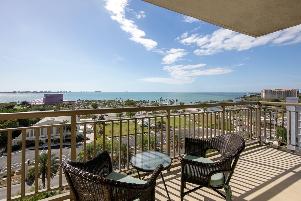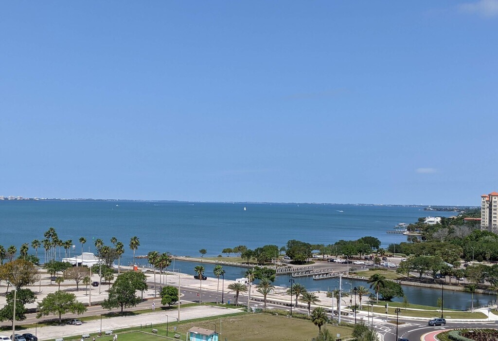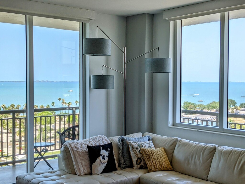 Impressive 2 Bedroom, 2.5 Bath, double corner on 10th fl. 6-8 Month condo rental between April 1 2026 and December 1, 2026. (NOT available December to April) Sweeping bay & city views from this 2-terrace condo in one of Sarasota's best condo buildings. Large master bedroom with king bed, wall-to-wall carpet, 65" TV, terrace with views of the pool, sundeck and the city. Updated en-suite bath. 2nd Bedroom has a king bed, wood floors, 60" TV, and full bathroom with walk-in shower. Kitchen has new white quartz counters, stainless appliances and windowed breakfast area. Six-seat glass dining table. Living room has expansive bay and skyline views, white leather couch, 65" TV, motorized shades and many tasteful touches. Foyer with mirrored coat closet and half bath. Washer & dryer. Secure private reserved 2nd floor garage space included. Heated pool & sundeck, hot tub spa, fully equipped fitness center, saunas, outdoor grilling area, meeting rooms, library, in-house movie theater and business center. The Alinari is a beautiful 18 story condominium on a private street. Easy walking distance to the Sarasota lifestyle. 24 hour attended lobby. One month Security/Damage Deposit. Leases of less than 183 days are subject to Fla state and local tax. All Applications and Background checks subject to Condo approval and all funds are payable in full prior to commencement. No smoking, no pets. Call to arrange inspection, by appointment only. Contact Barrett via phone (or email)