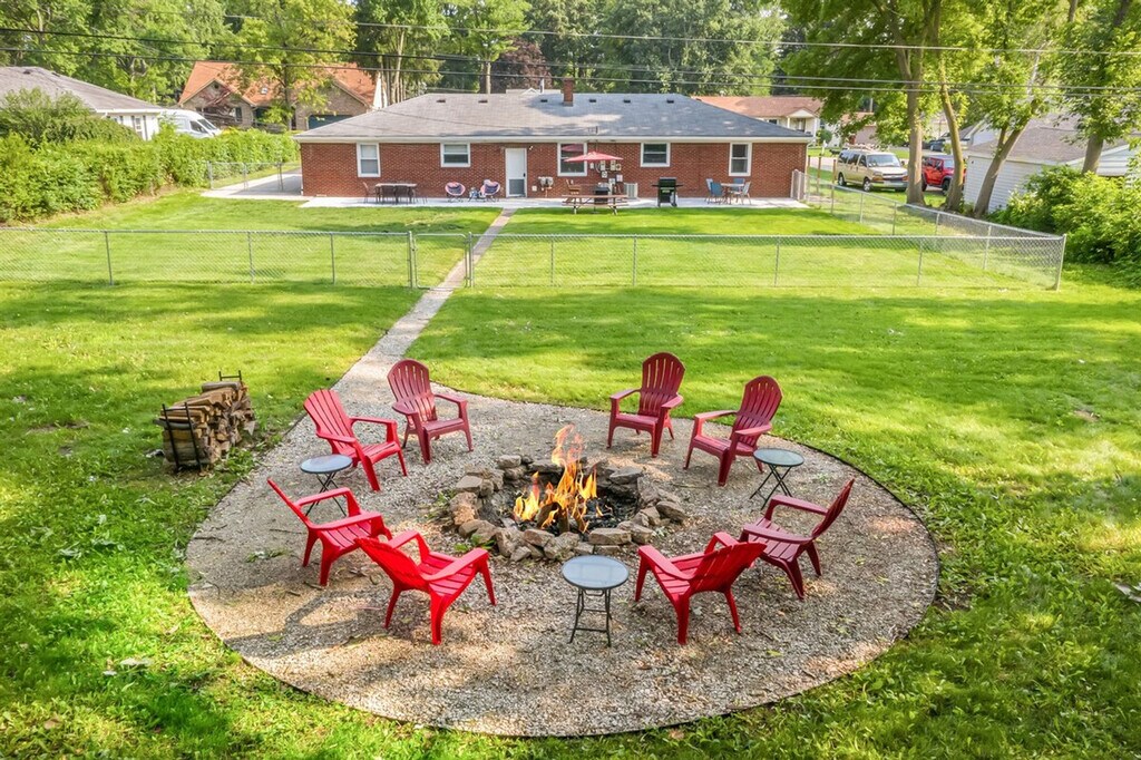 Relax and enjoy this spacious and comfy apartment flat, situated in a serene location in Shelby Township. This relaxing retreat is perfect for your visit, whether you're traveling for work or vacation. The apartment features two comfy bedrooms with queen-size beds, a fenced backyard, a fully equipped kitchen, a shared fire pit, a smart TV, and high-speed Wi-Fi. A blend of comfort, style, and convenience greets you as soon as you step inside. The living area is the home's heartbeat, with a lively living room leading into the fully equipped kitchen and its charming dining area. Large windows and balcony doors allow for plenty of natural light to illuminate the space throughout the day, creating a feeling of pure warmth. Comfortable bedrooms are designed to offer all the rest you need after a long day of work. Finally, take a stroll around the lush green yard to catch some fresh air and clear your head. This pet-friendly unit charges a $150 fee per pet. Non-approved pets will incur a $500 fine, and failure to disclose pets may result in the cancellation of your booking without a refund. A 3% charge applies for processing payments and an additional 3% charge for refunding payments. The home is nestled in a serene, family-friendly neighborhood in Shelby Township, MI. It offers a safe escape from the big city crowds while being just a few steps away from the bustling avenue, full of restaurants, shops, bars, and attractions. Business travelers will enjoy the proximity of major employers and transportation options, making your commute less of a hassle. Vacationers will enjoy the calm and serene location, surrounded by trees and greenery. Popular places of interest include Van Dyke Avenue, Detroit Zoo, Lake Saint Clair Metropark, Detroit Institute of Arts, Motown Museum, Downtown Detroit, and Belle Isle. Check-out time is 11 AM, and a $250 fee will be charged if you check out after 11:15 AM. Quiet hours are from 9 PM to 8 AM daily, with a $250 fine for noise complaints. Please do not move furniture, as a $250 fine applies if furniture is moved from its original position. An excessive cleaning fee of up to $250 may apply for dirt, mud, or stains on floors or rugs. Smoking is only allowed outside, with a $1000 fine for smoking inside the unit. Dispose of all smoking waste in the green dumpster, and a $250 fine will be charged if debris is left behind after your stay. The home is part of an attractive brick duplex, sharing the laundry room and backyard with guests in the other part of the duplex. Long-term bookings may require a signed lease for stays of 28 days or more. Security devices are present surrounding the entire exterior of the home, but there are no video cameras or recording devices inside the home. The living room includes a comfortable sofa with pillows, a dining table with seating for four, a 55” smart TV, comfy leather chairs, a coffee table, and reading lights. Feel free to use the office desk if you need to attend to business. High-speed Wi-Fi is available throughout the apartment. [SI]