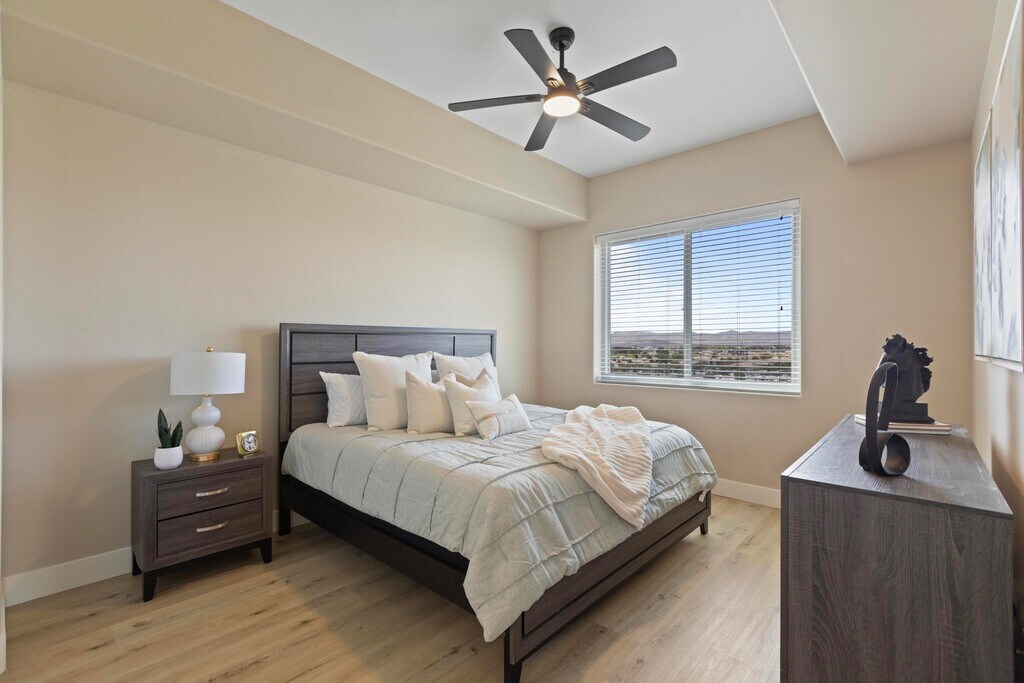 TWO WEEKS FREE RENT*** Welcome to Gorgeous One Las Vegas! This stunning 1-bedroom, 1-bathroom unit boasts spectacular mountain views, dark wood flooring, dark cherry cabinets, and upgraded fixtures. The large balcony and walk-in closets provide ample space for storage and relaxation. You'll enjoy the luxurious lifestyle with amenities like a concierge, security, fitness center, business center, community pool and spa, and cabanas. Our active social calendar makes it easy to meet new people and enjoy everything Las Vegas has to offer. Don't miss the opportunity to call this unit your new home!