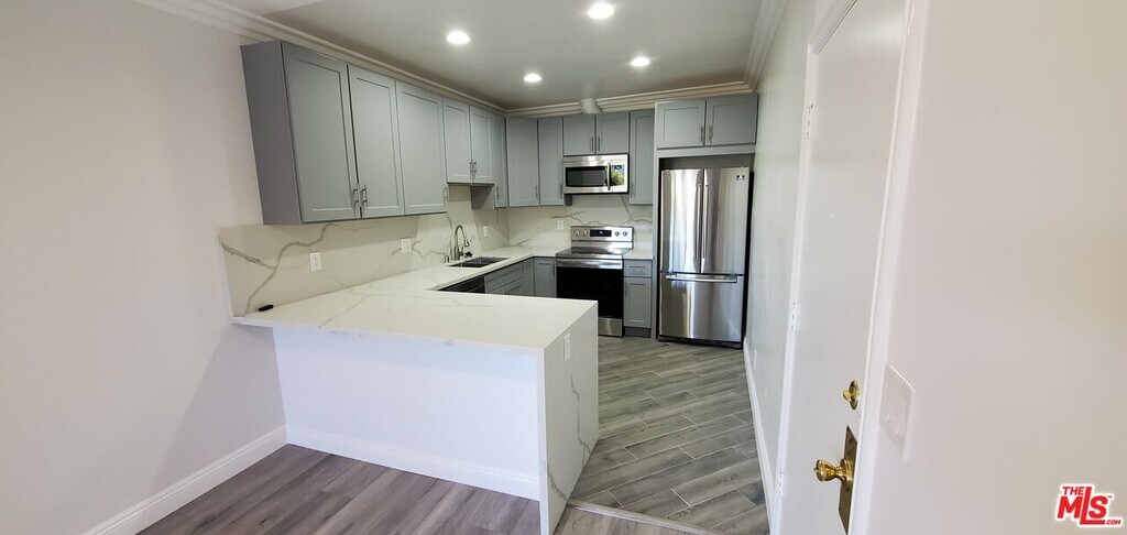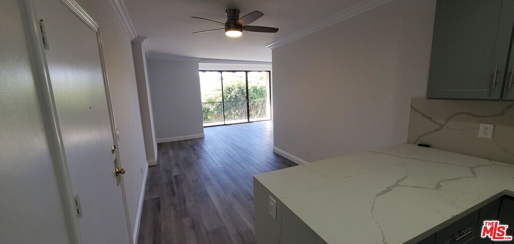 Natural light pours into this spacious TOP floor TROPHY corner unit 2 bedroom, 2 bath on gorgeous tree-lined street literally around the corner from Montana Ave steps to the beach. Remodeled, from top to bottom with higher end finishes. Tree-top views, excellent privacy. Architectural features with HIGH ceilings in some rooms. Loft-like open design: brand new marble look quartz counters with upscale appliances. Gorgeous and luxurious custom shower enclosures. Large living/dining room with breakfast bar/island. Recessed LED lighting. Balcony open to ocean breezes. Updated modern flooring. Secure building with intercom-controlled entrance. Two exposures gives nice cross ventilation. Three-zone heating. Large closets including walk-in. Wired for FIOS. One parking space in secure underground garage. Community laundry. 1 year lease with rent control. Hot water and trash service included. MLS# 25603723
