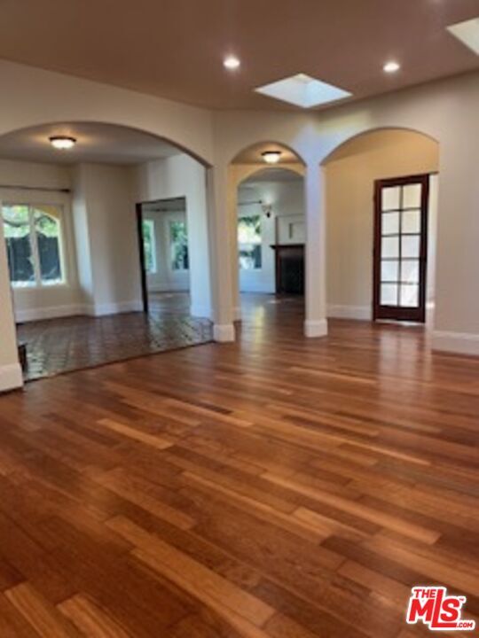 Exquisite remodel in 2008. This elegant Spanish-style home effortlessly blends timeless Mediterranean charm with modern luxury. It features gorgeous new hardwood floors, arched doorways, high coved ceilings, and recessed lighting throughout. A wood-burning fireplace highlights a huge living room with endless windows allowing natural light to stream in from every angle. The spacious remodeled kitchen offers endless counter space, refinished wood cabinetry, and stainless steel appliances. One bedroom and a full bath downstairs, along with an office. Three large bedrooms and two full baths upstairs, including an additional dwelling unit with a half bath and separate entrance that could be used as the fifth bedroom. Large oversized garage. This spectacular property has so many outstanding features, you have to see it to believe it!