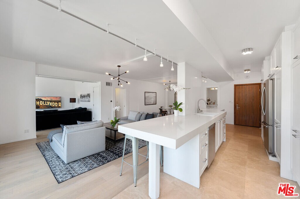 Designer Condo at 838 Doheny. Setting the bar for luxury living in LA. A sophisticated open space, retractable Fleetwood glass doors showcase a wrap around patio for ultimate indoor/outdoor living. An entry leads to open-concept living room, formal dining and chef's kitchen. Custom European cabinets with waterfall countertop, Subzero, Miele, Bosch appliances, creating a perfect layout for entertaining. The living area with surround sound Sonos system, motorized solar shades, Lutton lighting controls, Nest and air filtration system. The two-bed unit features a primary with ensuite bath a dual vanity, soaking tub, glassed shower, heated floors, walk-in closet and extra storage. A guest room and 2nd bath complete. Wide-plank Oak floors throughout, new electrical and plumbing systems, private laundry with pantry area. Building amenities: a roof-top pool with sundecks and dining areas, fire-pits, gym and 360 degree views from city to ocean. A 2nd pool, full time concierge and valet. Cable, internet, HBO, and water included.