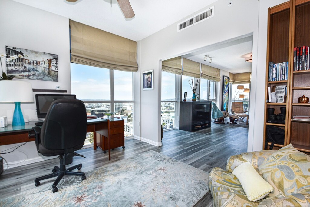 Luxury Downtown Living at Discovery on Cortez Hill Experience urban sophistication in this elegant 4th-floor,west-facing end unit at the prestigious Discovery at Cortez Hill. Enjoy the charm of a quiet,tree-lined neighborhood with all the excitement of downtown San Diego just moments away. This spacious and light-filled residence features high ceilings,floor-to-ceiling windows,and French doors that open to a charming garden-view balcony. The open-concept living area includes a cozy fireplace and beautiful finishes throughout,including dark walnut wood laminate and rustic tile flooring. Designer touches such as silk dupioni window coverings with wrought iron rods from Pottery Barn elevate the home’s style. The kitchen offers upgraded appliances and a tasteful paint palette creates a warm,inviting atmosphere. Discovery provides resort-style amenities including a rooftop pool and spa,BBQ and entertainment areas,fire tables,a top-of-the-line fitness center,steam and sauna rooms,and a business/conference lounge on the 2nd floor. Enjoy the best of downtown living with a touch of tranquility — welcome to Discovery at Cortez Hill. MLS# 250042724
