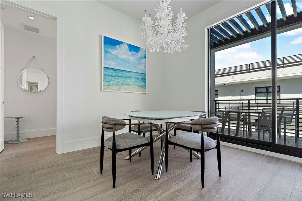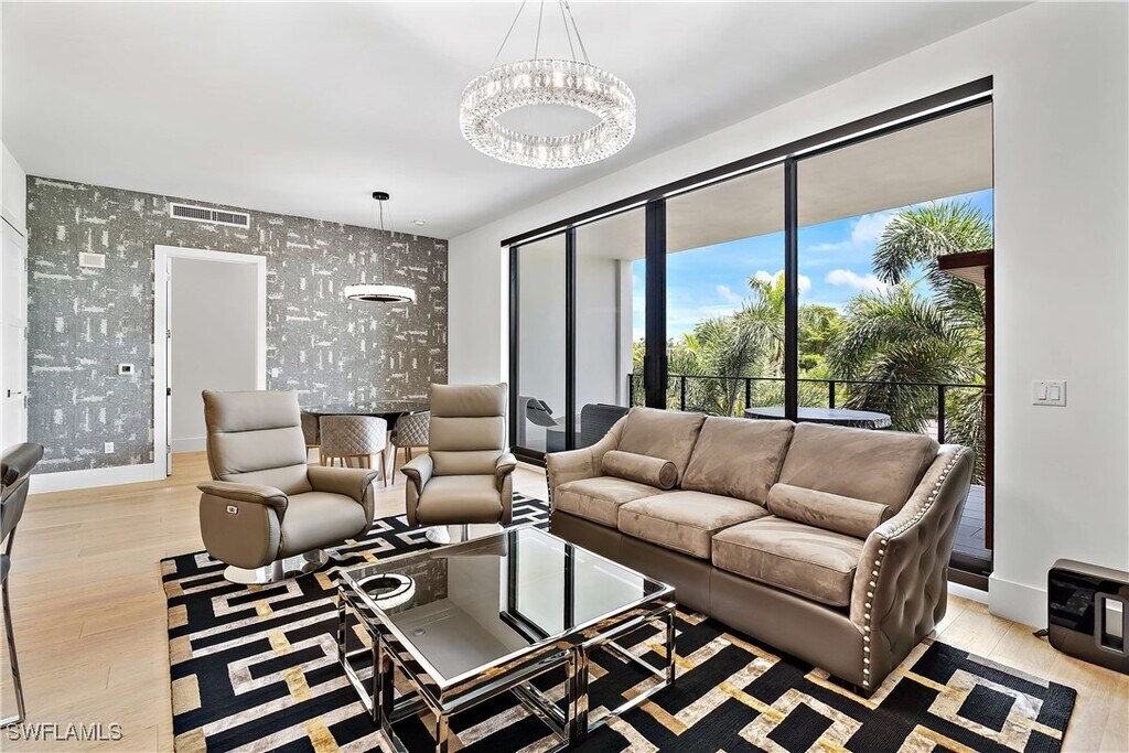 Experience Coastal Elegance in Downtown Naples! Welcome to Eight Fifty Central,a stunning corner unit condominium in a prime walkable downtown location. This beautifully furnished,single-level home offers a blend of contemporary style and luxurious comfort. The spacious layout features three bedrooms with a king-size bed in the master suite,a queen bed in the guest bedroom,and a versatile third bedroom set up as an office/den with a sleeper futon. All three bedrooms are ensuites,providing ultimate comfort and privacy. Step into a world of sophistication with high-end interior upgrades,including DuChateau engineered wood flooring throughout,top-of-the-line appliances,a Wolf natural gas range,designer cabinetry,3-inch waterfall quartz countertops,LED lighting,and 10-foot ceilings that highlight the large windows and abundant natural light. The open-plan kitchen and living areas flow seamlessly onto a spacious covered lanai,perfect for entertaining or enjoying breathtaking sunsets. Enjoy exclusive amenities,including an assigned covered parking space,a second-level pool area with multiple seating areas and green space,and a rooftop gathering area complete with a fire pit and barbecue station. Located just a few blocks from the beach and the renowned 5th Avenue South,this property offers the perfect opportunity to immerse yourself in the Naples lifestyle.