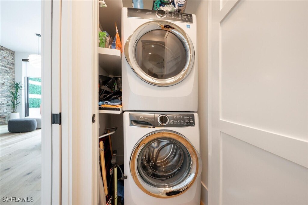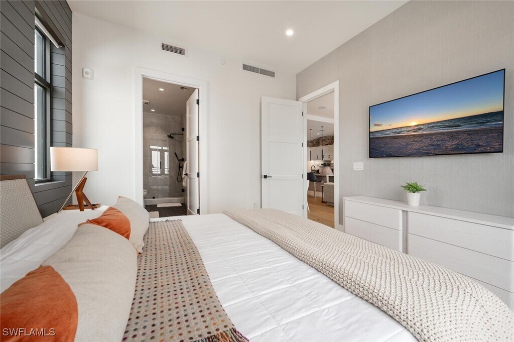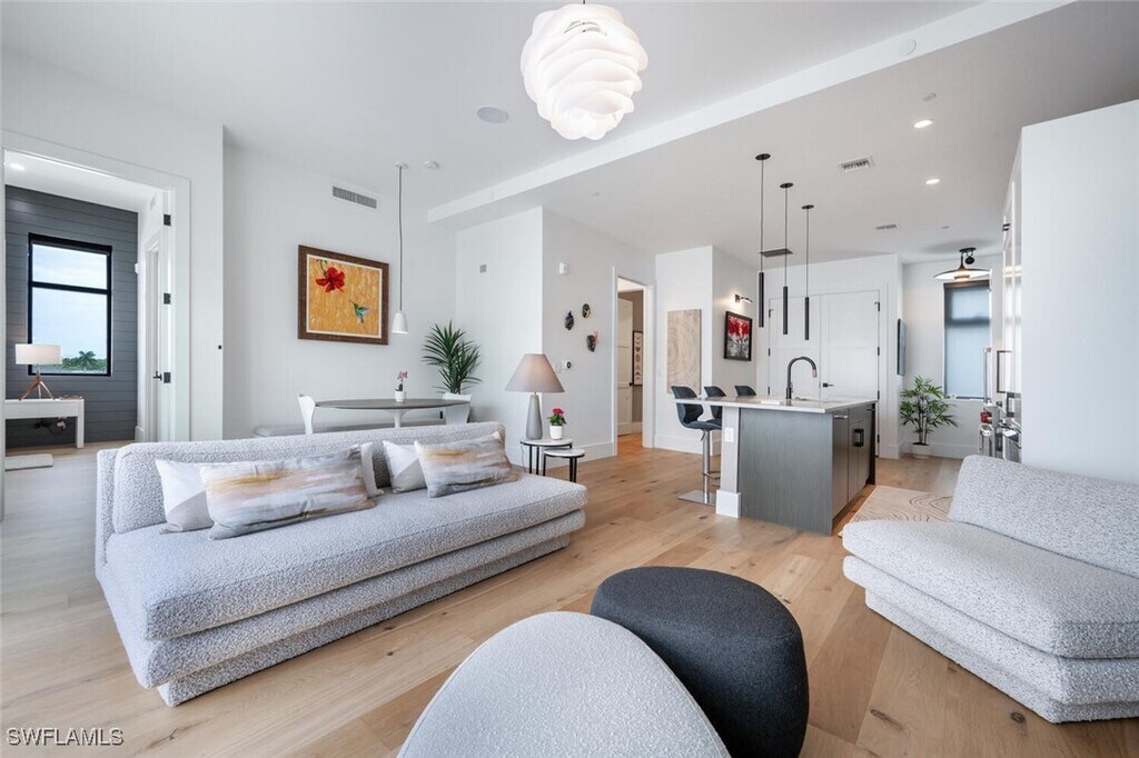 Beautifully appointed 2-bedroom,2-bathroom condo in the vibrant heart of Naples,FL. This modern and elegant unit offers a perfect blend of comfort,style,and convenience. Sleek kitchen features high-end stainless appliances and oversized island with counter seating. The well-designed floorplan maximizes space and natural light with a comfortable main living area boasting large flat screen TV and full-size dining area. Expansive sliders open to your private balcony with additional dining and lounge seating. Primary bedroom is thoughtfully designed with a king bed,workspace,and en-suite bathroom. Guest room features a queen bed,views of the pool,another workspace and easy access to a second full bath. Laundry in unit. Sparkling community pool on the 2nd floor of the building adjacent to a grassy common area with hammocks for relaxing in the sun without leaving the property! Venture upstairs to the 4th floor of the building for access to a community outdoor kitchen with dining/lounge space with gas firepit! Everything you could desire and more - shopping,dining,art,parks,beaches,nightlife etc. - all within steps from your front door. Covered parking garage in building.