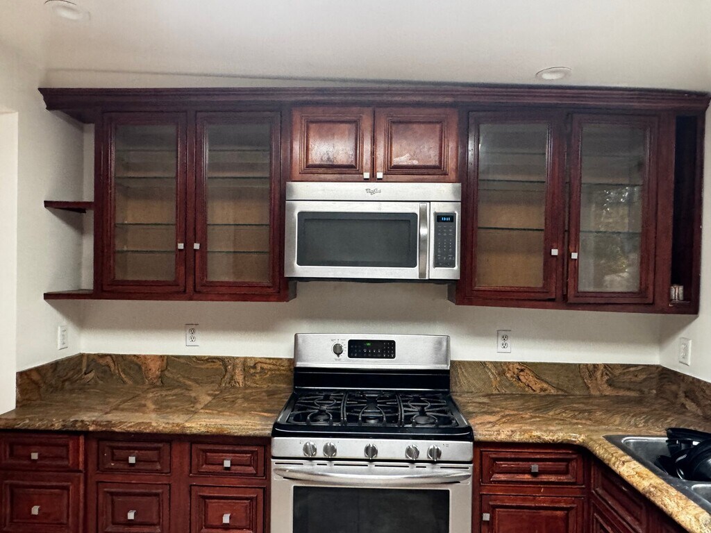 Charming 850sq ft of living space plus rap-around patio surrounding the property accessible through sliding doors. Semi private back oasis. Many private spaces throughout the garden. The one bedroom apartment has open floor plan. Most of the house is covered with Prego flooring. New tiles in the spacious kitchen, lots of cabinets, stainless steel dishwasher, microwave, stove and refrigerator. Bathroom all tiled has plenty of cabinets and jacuzzi tub. The bedroom has a sliding door to the patio and walking closet. One side of the living room consist of three sliding door to the patio. Tall focus trees bring ample privacy and charm to your home. Recess lighting throughout the house. Large built in glass shelved with sliding door make one side of the dinning room. Centrally located, Block and a half from a large shopping center with smart & fine, target fitness center,…..and bus stop.