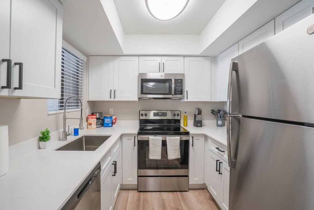 The advertised rate of $2,176/month is the lowest available price, based on a 30 day(s) stay with a move-in date of May 24, 2026. Rates vary depending on the duration of stay, season, and other parameters. For exact pricing and additional pricing components, please visit our website and enter your desired move-in and move-out dates. The rate is applicable when billed upfront; it can be higher if billed in multiple payments. Discover serenity and feel at home in this chic 2-bedroom retreat in the heart of Scottsdale. The living space features an innovative open-concept design that blends the living and dining areas with the kitchen, creating a modern and sleek living experience. The living room includes a sofa bed, chair, 4K 55" HDR smart TV, and coffee table. The fully equipped kitchen features a microwave, stove, oven, refrigerator/freezer, dishwasher, toaster, coffee maker with coffee essentials, electric kettle, sink with hot and cold water, glasses, silverware, pots and pans, and a dining table with chairs. Bathroom 1 and 2 each feature a bath with a shower, wash basin, mirror, toilet, towels, hand towels, washcloths, and essential toiletries. Parking is available on the premises, and instructions will be given at check-in. Pets are allowed depending on size or if they are service animals. To avoid having your reservation canceled, please inform us in advance. An additional cleaning fee is required per pet: 1-7 Nights: additional $25/night, 8-29 Nights: additional $200, 30+ Nights: additional $300. There is a 2 pet maximum and only cats/dogs are allowed. Immerse yourself in the vibrant energy, surrounded by award-winning restaurants, eclectic shops, and historic landmarks. With convenient access to attractions, this stylish apartment serves as your gateway to seamless exploration. Quiet hours are between 10pm and 8am every day. If there are noise complaints or any violation of this rule, it may result in cancellation of booking and removal from property without refund. There is a strict no-party policy. If there is a party of any kind the police will be called and everyone will be removed from the property with no refunds. No unauthorized guests are allowed at the unit, and there is a $100 fine per guest if discovered. Smoking is prohibited without exception on this property, including balconies and in or around the building. If any signs of smoking are found in the unit or on the premises, a fine of $500 will be imposed. If you are found to have brought pets without prior notification, there will be a $500 fee. There are noise monitors installed in the unit that measures the noise levels in decibels. If tampered with, there will be a fee. If a lockbox is provided, it must be kept locked at all times. Some stays have auto-locking doors so keep the keys on you. If there is a delayed checkout, there will be a $500 late check out fee. You may be charged extra for cleaning if the property is left in a state that necessitates additional cleaning. Lost or unreturned keys will incur a fee of $80 for key replacements and $150 for key fob replacements. All guests must be 23 years old and above. To abide by all legal requirements and building security rules, you may be asked to provide a copy of your official government-issued photo ID, confirm your contact information, provide a valid credit card with a name that matches your ID and pass through a verification portal. Bedroom 1 includes an office desk and chair. [SI]