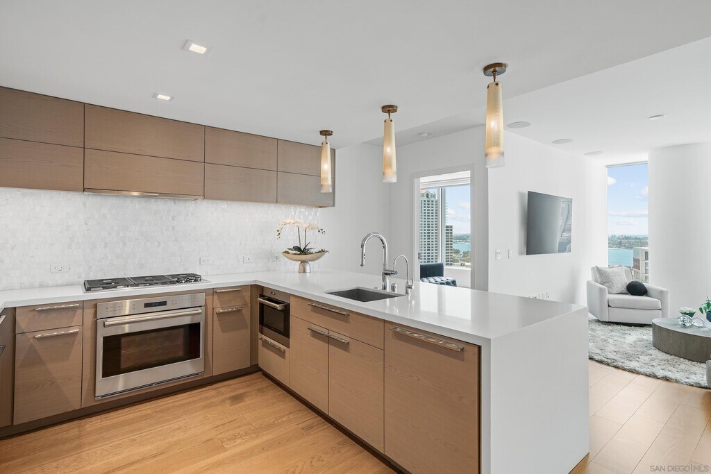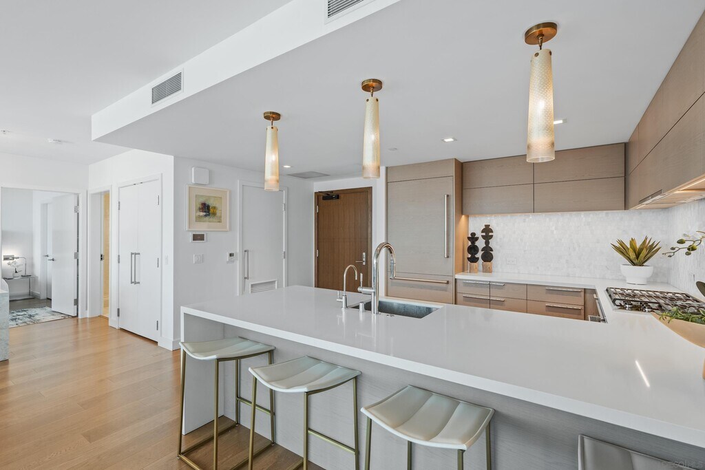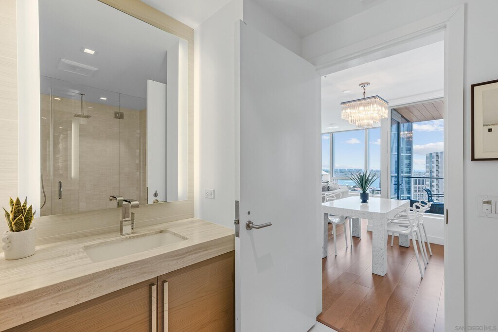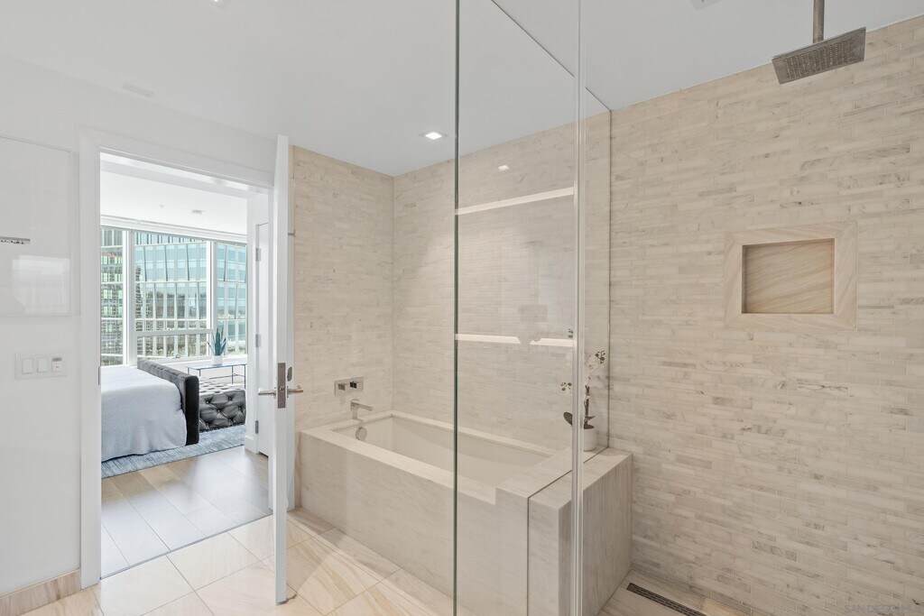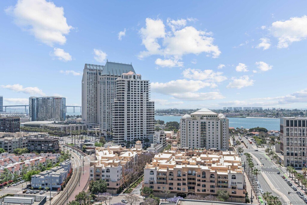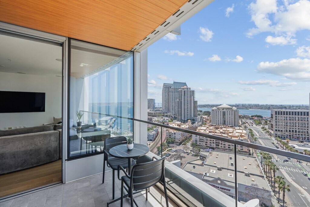 Turnkey luxury furnished rental at the iconic Pacific Gate offers an unmatched blend of sophistication and comfort,showcasing breathtaking panoramic views that span from the vibrant city skyline to the sparkling San Diego Bay and the Pacific Ocean. Upon entering,you're welcomed by an abundance of natural light streaming through expansive windows. The chefs kitchen features sleek appliances,Caesarstone countertops,and an elegant layout perfect for culinary creativity. The primary suite offers sweeping water views and a spa-like ensuite bathroom,complete with luxurious finishes,an LED-lit anti-fog mirror with a built-in TV,a soaking tub,and a separate glass-enclosed shower. This residence seamlessly blends beauty with modern technology,boasting smart home features that allow effortless control of lighting,climate,and motorized window shades. A private balcony invites you to unwind with your morning coffee or enjoy a glass of wine while watching the sunset over the horizon. Resort-style amenities elevate the experience further,including chef concierge,a pool terrace with cabanas,an outdoor cooking area,a cozy fire pit,a resident lounge with a catering kitchen,a screening room,a business and conference center,and exclusive access to a residents-only yacht share program,a luxury car fleet,and onsite restaurant. The best of America's Finest City is at your doorstep. MLS# 250024840