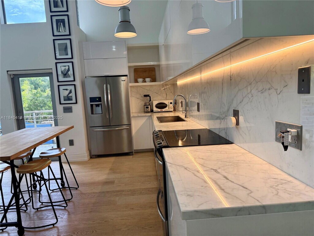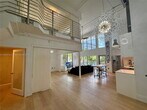 - loft NYC open style condo~~Must see! South of Fifth stunning NYC OPEN style Loft with soaring 20ft double-height ceilings, light wood floors, floor-to-ceiling windows offering an abundance of natural light. Bright primary suite on the upper level of the loft, the second bedroom (w/Murphy Bed) on main level. Configure rooms for how YOU live. Both with sliding fabric shades for privacy.(see photos). Expansive floor layout w/ balcony, elegant Boffi kitchen, stainless steel appliances, washer & dryer, and upgraded bathrooms. Building amenities: outdoor pool, shared rooftop, elevator, secured lobby. One assigned secured parking space and WIFI included. Steps to the restaurants, cafes, boutique shopping.