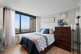 DIANA TRONTExperience sweeping NEW YORK skyline views from every room in this quiet corner unit,perfectly situated for maximum privacy. Located on the 3rd Floor Lobby level, (no elevator needed to the unit-) this home offers rare conveniences within a full-service building, A private balcony w/sliding glass doors is accessed from the spacious living room(20 x 13) leading into a separate DR (11.6 x 9), All rooms overlooking Manhattan. The kitchen is thoughtfully designed with a sleek glass-tiled backsplash, light colored Poggenpohl cabinetry, modern stainless appliances, charcoal colored heated tiled floors. The Master BR includes a stylish tiled shower,dual-sided mirrored medicine cabinet, generous walk-in closet with barn door closure. French doors lead to a versatile 2nd bedroom--perfect as a home office,guest room or den. The hall bath features heated floors & a relaxing jacuzzi tub & shower. Floor to ceiling closets, custom blinds, ALL Utilities included, heat, hot water, electric, cooking gas, internet.,use of outdoor pool, 24 hour security/concierge, package pick-up. 1 covered parking space included in rent. Blocks to NY buses and Blvd East mini vans, 186 acre park with spring/summer fountains. A rare blend of luxury, convenience and iconic views--this home is a rare find in this market."