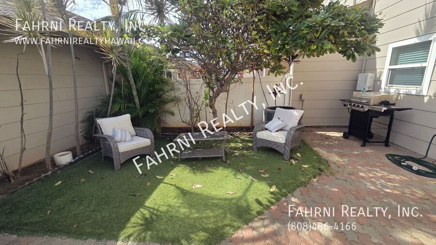 Welcome home to this spacious and modern two-story townhouse located in the highly desirable Ke Noho Kai III community of Ewa Beach. Offering approximately 1,196 square feet of thoughtfully designed living space, this home features a seamless open layout on the ground floor, including a bright living room, dining area, and a fully equipped kitchen with a refrigerator, stove, dishwasher, and disposal. For added convenience, a guest half-bath is also located on the first floor. The second floor serves as a private retreat, housing all three bedrooms and two full bathrooms. The primary suite is particularly impressive, featuring a large closet and an en-suite bathroom with a double-sink vanity. Comfort is guaranteed year-round with central A/C and ceiling fans throughout the home. Transitioning outdoors, you will find a charming fenced courtyard and patio area located between the main house and the detached two-car garage, providing the perfect private space for outdoor relaxation or entertaining. Conveniently situated near guest parking, this home is just minutes away from local schools, parks, shopping centers, and a variety of restaurants. Rent includes water, sewer, and trash services, and the unit comes equipped with a stack washer and dryer for your convenience. This townhome offers the perfect blend of privacy—and the vibrant lifestyle of the Ocean Pointe community. 2 Car Garage Rec Center