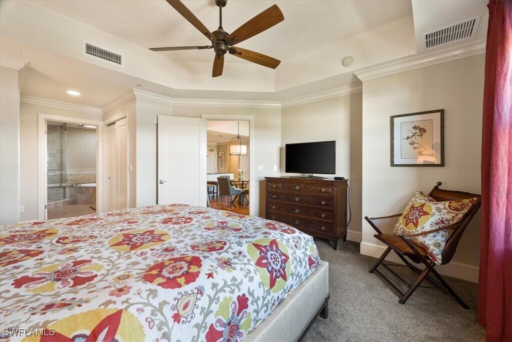 URBAN LIVING with a Naples twist! Just minutes from Vanderbilt Beach,The Strada at Mercato offers quiet,secure,contemporary living coupled with upscale shopping and dining in this trending North Naples neighborhood. This two bedroom,two bath 1500 sf 4th floor retreat offers both luxury and comfort. Relax in the leather dual-reclining sofa in front of the large wall-mounted TV. The bedrooms each offer king - sized beds. The primary bedroom suite has two closets and a primary bath with a soaking tub,walk-in shower,and separate water closet. The guest bedroom also has an en-suite bath that can also serve as a guest bath. People watch and enjoy the sunset over the plaza from your large open lanai or head 2 miles down the road to see a beach sunset. As a resident at The Strada,you have access to the Amenity Level which offers the use of the roof-top 52-foot heated pool with waterfall and spa,community gas grills,an open fire pit and multiple comfortable outdoor seating areas. Also available is a very-well-appointed fitness center and an extraordinary venue room with a bar and catering kitchen to host special events. The Strada is a pet-friendly community and offers a "dog run" for your convenience and their pleasure. The unit comes with two assigned,secured,and covered parking spaces as well as a storage closet for a long-term tenant.