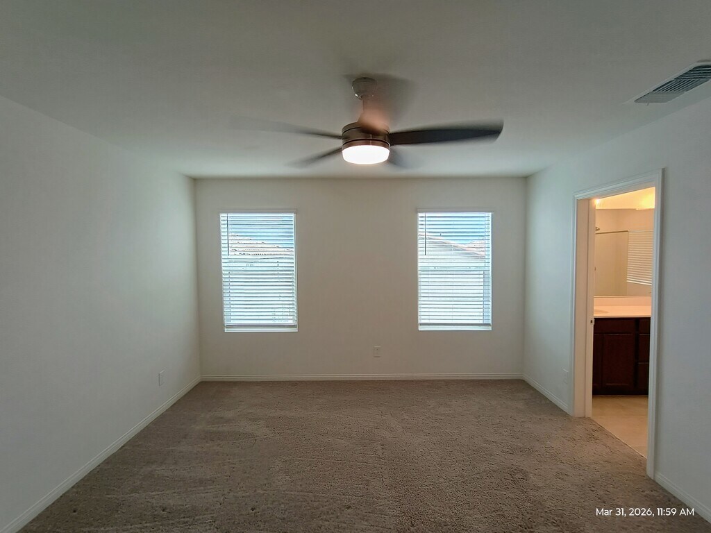2 story house with 3 bedroom | 2.5 baths | 2 car garage in gated community near Cimmaron & Blue Diamond. Open floor plan downstairs. All bedrooms upstairs. Laminated flooring throughout the house excepting bedrooms (carpet)and bathrooms ( laminated wood). Appliances included. Minimal backyard maintenance required. Tenant pays $45.18 monthly for sewer and trash which is included in the total rent shown.