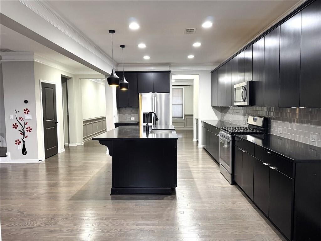 Beautiful 5-bedroom,4-bath home located in the highly sought-after South Forsyth School District,nestled in The Grove at Spring Valley. This home features a guest bedroom on the main level,perfect for visitors or a home office. The spacious eat-in kitchen offers stainless steel appliances and opens seamlessly to a large family room showcasing a stunning accent wall with built-in shelvingideal for everyday living and entertaining. A formal dining room with butler's pantry adds both elegance and functionality. Upstairs,the oversized primary suite includes a luxurious bath with an enlarged frameless glass shower,double vanities,and generous space. Three additional spacious secondary bedrooms are also located upstairstwo share a Jack-and-Jill bath,along with an additional hall bath,bringing the total to four full bathrooms. Conveniently located near shopping,dining,and walking trails,this home is truly a must see. MLS ID 7724107