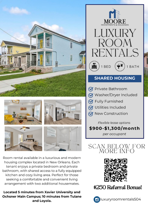 Property Id: 1751464 SHARED HOUSING in Newly Constructed Modern Duplex! This luxurious multifamily home is located 5 mins from Xavier University and Ochsner Main campus, and 10 mins from Tulane & Loyola. This top unit is SHARED OCCUPANCY and consists of 3 separate room rentals, Suite A, B, & C. All Suites/Rooms come equipped with keypad locks. This listing is for Suite C in the top unit. This bedroom is fully furnished with a full size bed, mounted TV, desk, night stand, and modern decor. The suite also features a private bathroom. The Palisades is a positive and cohesive housing community. This SHARED LIVING SPACE is between 3 tenants and includes the kitchen, living room, and laundry room, which also feature brand-new stainless-steel appliances and quartz countertop finishes. The property also has Driveway and Off-Street parking with security cameras. This property is great for graduate students or traveling professionals. *$250 Room Referral *All Utilities Included *Fully Furnished *Private Bathroom