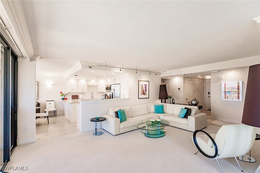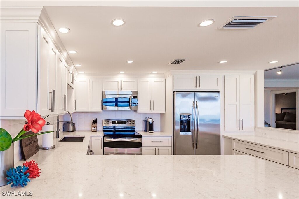 Sand,sea and sky are the constant backdrop from this bright and sun-filled spacious 2 bed 2 bath condo directly on the sand at Vanderbilt Beach. The unit has unparalleled gulf views from the modern living area and newly renovated eat-in kitchen. Full wall of sliders leading out to the oversized balcony spanning the full length of the living area. Enjoy the famous Naples sunsets and watch the dolphins cruise by from your private screened balcony. If you must work,the condo is equipped with a workstation overlooking the community pool. Two large bedrooms with en-suite baths and ample closet space on either end of the condo allow privacy for guests and family. In unit laundry,elevator access and common area parking Residents at the Seawatch can walk directly onto the beach,or a short stroll or drive to fine dining,shopping,entertainment,Mercato,or downtown Naples. The ideal retreat for your Southwest Florida getaway!