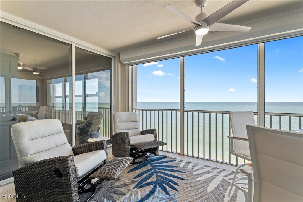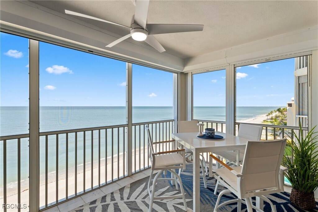 A quiet retreat on Vanderbilt Beach,7th-floor beachfront condominium offers direct Gulf views,bay views,and private beach access. This 2-bedroom,2-bath property features an open main living area designed to capture the western exposure. Sliding glass doors connect the living space to a large screened lanai,providing an outdoor area suitable for dining or seating. Remote-controlled solar shades are installed in the living room for light and privacy control while maintaining visibility toward the water. The kitchen includes full-size appliances,upper and lower cabinetry,and countertop workspace appropriate for everyday use. The adjacent dining area supports a full dining table configuration. A wall-mounted television in the great room is installed on a swivel mount,allowing viewing from both the living area and lanai. The primary suite is positioned on the Gulf side of the residence and includes a walk-in closet,dual vanities,a walk-in shower,and a separate soaking tub. Automated blackout shades are installed on the bedroom windows. The guest bedroom is located on the opposite side of the floor plan,offering bay views,a large closet,and a workstation/vanity area. A full bathroom is situated next to the guest room and also functions as the main hall bath. Additional interior features include in-unit laundry with a full-size washer and dryer. The layout provides separation between the two bedrooms and an open central living space oriented toward the Gulf. Sea Chase is a gated Gulf-front community with direct beach access,a beachfront pool,sun deck,two elevators,and assigned parking. The property is located between La Playa Beach & Golf Resort and The Turtle Club,with additional nearby beachfront dining options. The community is within close proximity to the Ritz-Carlton,Vanderbilt Beach; Mercato; Waterside Shops; and other retail and dining destinations. Downtown Naples and Fifth Avenue South are approximately 4.5 miles away,and Southwest Florida International Airport (RSW) is approximately 26 miles away. The surrounding area offers multiple beaches,walking paths,marinas,and access to various water activities. The residence provides a functional floor plan,western exposure,and direct access to Vanderbilt Beach within a secure community setting. All property information,room measurements,and community details should be verified by buyers and their agents,as association rules and features may change.