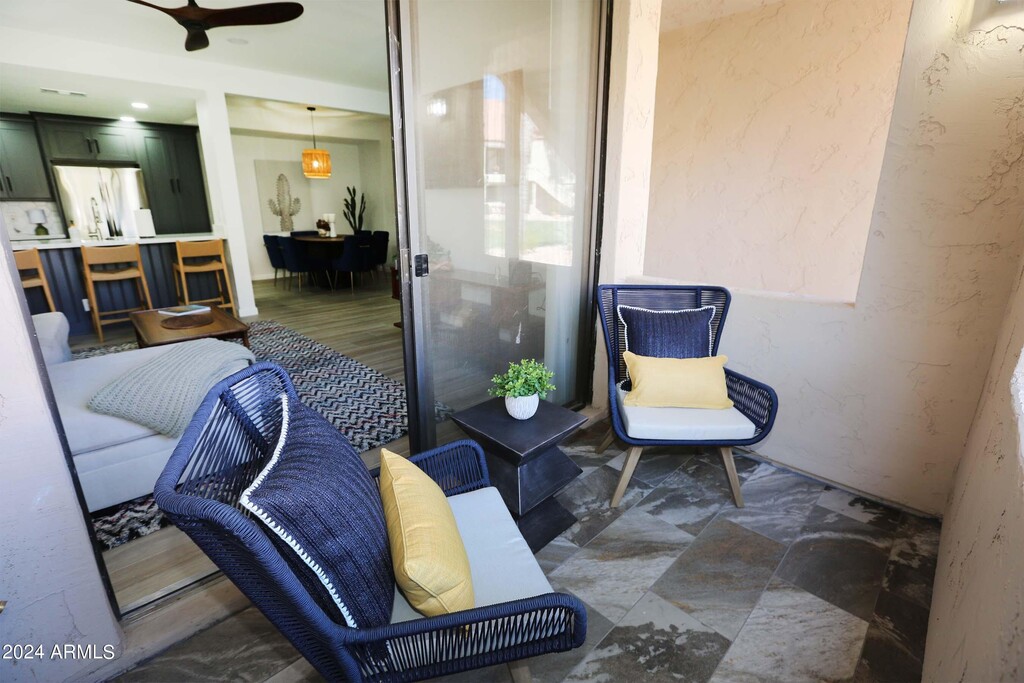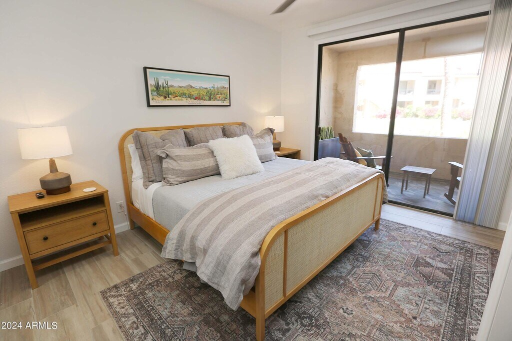 Experience resort living at its finest in this beautifully maintained 2-bedroom,2-bath lower-level condo located in the sought-after Hampton Courts at The Racquet Club within Scottsdale Ranch. This light and bright end unit offers an open floor plan with no interior steps,a cozy fireplace,plantation shutters,and two private patios. The kitchen is equipped with all appliances,a pantry,and breakfast bar that opens to the living and dining areas. The primary suite features a walk-in closet and updated 3/4 bath with a walk-in shower. Additional highlights include stacked washer/dryer,tile and carpet flooring,and extra storage. The gated community includes 5 pool and 6 spas plus 9 tennis courts. Clubhouse with fitness center,community BBQ's and lots of walking paths!