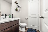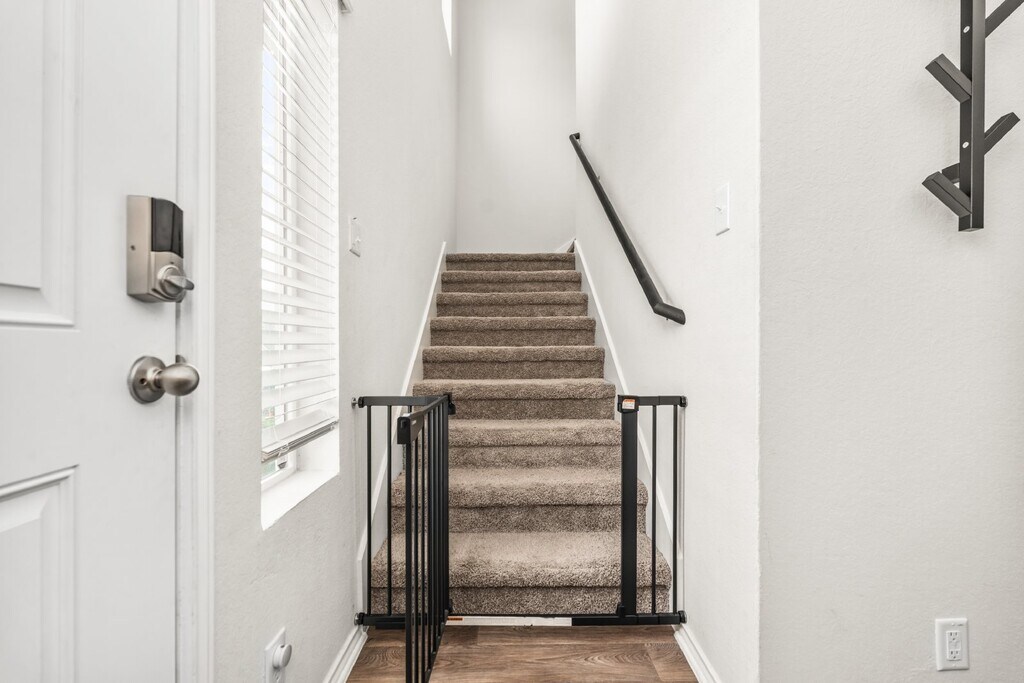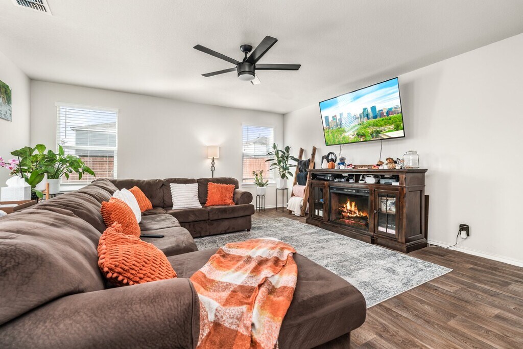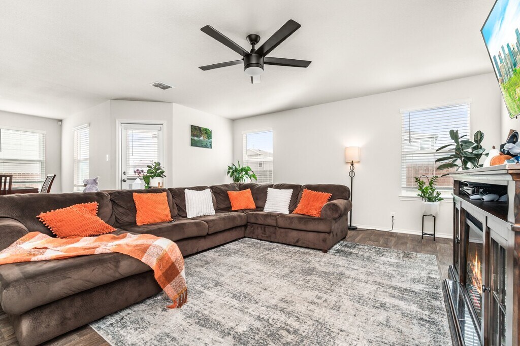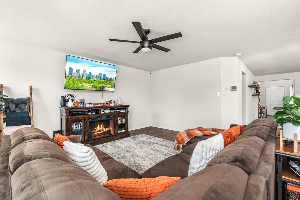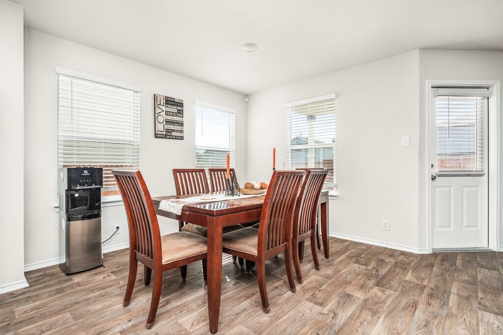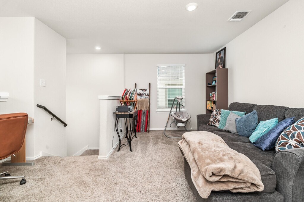 Cozy 4 bedroom 2.5 bath home available for rent. The inviting front porch and entry leads to a foyer. The foyer opens to the large open kitchen that includes a spacious kitchen island. The dining area is located adjacent to the open kitchen and large living area. The living room leads to the backyard and the relaxing covered patio. The utility room conveniently connects to the garage and a storage closet is located under the stairs. The loft/game room area, 1 primary room, three secondary bedrooms, and a secondary full bathroom are all located upstairs.