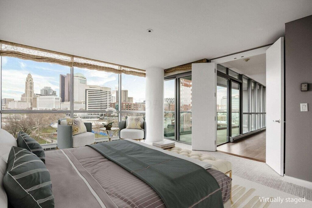 Luxurious 7th floor unit overlooking Columbus skyline with river views, open floor plan, floor to ceiling glass windows, large primary suite, 24 ft balcony, refinished wood flooring, and fresh paint throughout. Kitchen has stainless steel appliances, refinished cabinets, and built-in custom bar. Primary suite includes walk-in closet, motorized blinds, brand new carpet, linen closet and jacuzzi tub. Large utility room with washer/dryer and sink. 2 parking spots and additional storage room located in the building. Association dues are included: 24/7 concierge, social rooms, fitness, sauna, steam room, pool and more. Water and gas also included. Tenant pays electric. Minimum Household Income to be 3x rent. Minimum credit score of 625. Applicants must consent to background check.