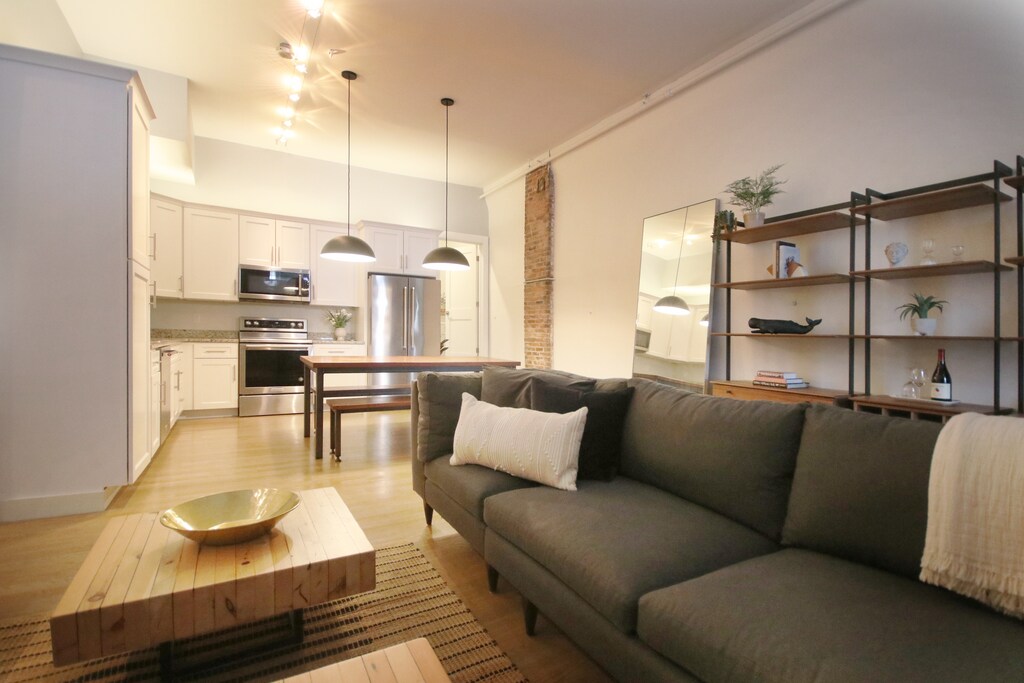 FULLY FURNISHED: 2 bed/1 bath, with open concept living area INCLUDES: (1) Parking Spot, Wifi, Electricity, Gas, Hot Water, Access to Free Laundry Room --------------- We’re pleased to list this apartment in the liveliest area of Portland, Maine. This appointed space is full of historic charm with vaulted ceilings, exposed brick and oversized windows - a nod to architectural details of the late 1800s. Modern finishes with unique historic charm. Designer furniture, fixtures and upscale appliances throughout. Lobster pot? You bet! The kitchen is ready to go with common cooking and baking gear, an electric kettle with pour over coffee carafe and filters, and of course the usual suspects: blender, toaster, mixer. Cotton linens and towels along with both down or poly filled pillows to choose from. Preferred cleaning supplies and tools are provided. Free laundry is onsite, with an iron and compact ironing board located in the apartment. Bluetooth record player and sound bar. Smart TV to connect your streaming accounts. Wifi is included. Live like a local! Be in the middle of everything, just steps away from multiple award winning, nationally recognized restaurants, bars & breweries, bakeries and coffee shops, close to parks & farmer's markets, live music venues, museums and just minutes away from catching a ferry to multiple islands along Maine’s Atlantic coast. Enjoy shopping local! One of the best parts about The Old Port is supporting artists and shop owners that live in this vibrant community. Multiple galleries and gift shops are in the area with unique Downeast treasures. The apartment is also less than a 15 minute walk to day-to-day favorites like Trader Joe's and Whole Foods. The Old Port is a vibrant destination for travelers and locals alike. Please be aware that there is the potential for noise from the street and restaurants/bars in the immediate area. If this is a concern, please consider before applying. PEAK SEASON: June 1 - September 30 // $6000 per month (negotiable for stays longer than three months)
