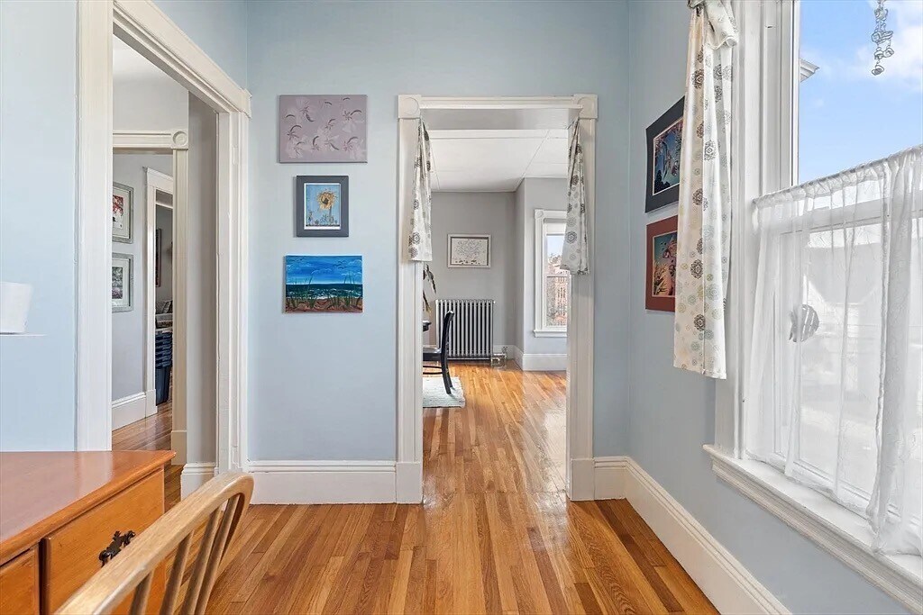 Bright, two floor, spacious unit with second and third floor living space with 3 bedrooms and 1 full bath. Second floor has hardwood floors throughout, sun-filled front to back open living/dining room area and bonus room perfect for a home office. The third floor is carpeted with three bedrooms. Heating is gas, forced hot water via radiators with additional mini split for both heat and a/c. Additional features include shared laundry, basement storage and on-street parking. Off street parking is available for an additional monthly fee. Tenants pays for all utilities (water and sewer are paid by Owner). Owner is seeking a 12/ 14 month lease. No smoking and no pets. Located near Malden center with easy access to Wellington Circle and Malden T (Orange Line) as well as local shops and restaurants. No Broker Fee. Requesting first, last and security deposit. Video tour available upon request.