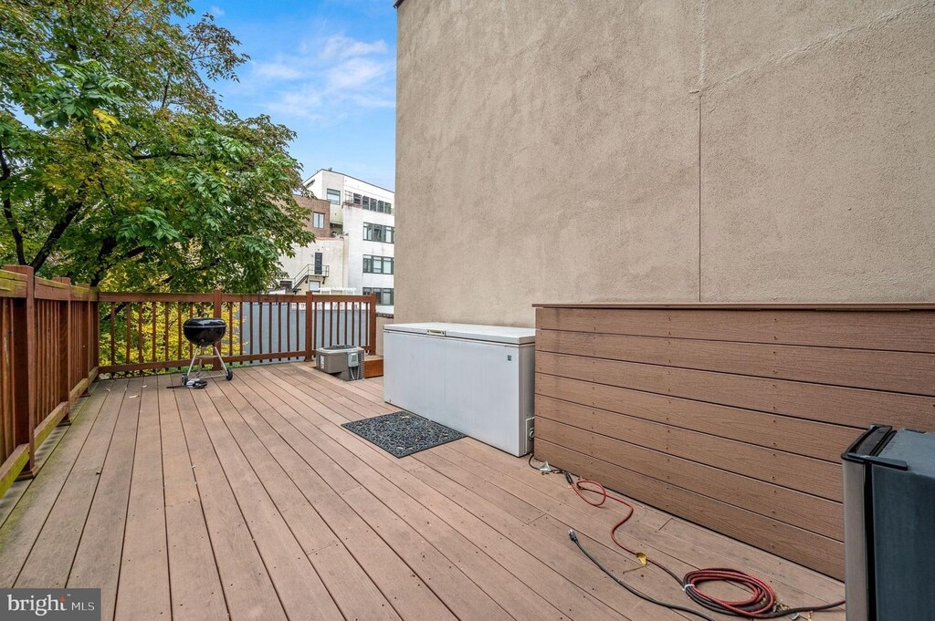 The Quincy - a thoughtfully divided piece of history in Old City, Philadelphia, blends comfort and modern improvements with unique original character, including touchless building and unit access for added convenience and security. 1 Bedroom, 1 Full Bath 2nd floor unit featuring high ceilings, large windows with wood floors, and a large private deck overlooking Cuthbert St. Enter to find convenient hall laundry and Full Hall Bath featuring a marble tile shower/ tub combo and vanity for storage. The Bedroom has steps up to access the nice large deck. Continue to the open-floor plan main Living area boasting a Kitchen with bright white cabinetry, Quartz countertops, stainless steel appliances, and a spacious Living/Dining room with an abundance of natural light and beautiful bridge views. This modern unit combines the best of both worlds—historic character and thoughtful updates—creating an ideal urban oasis in the heart of Old City.