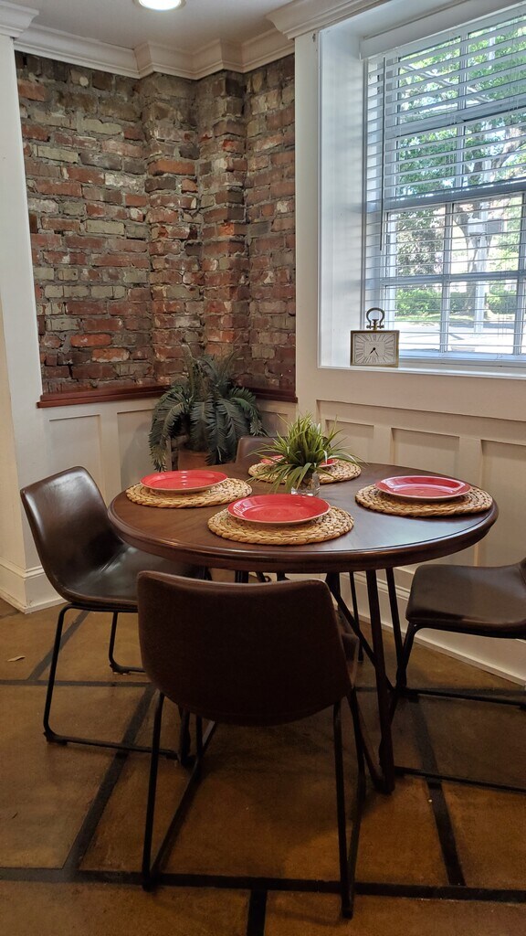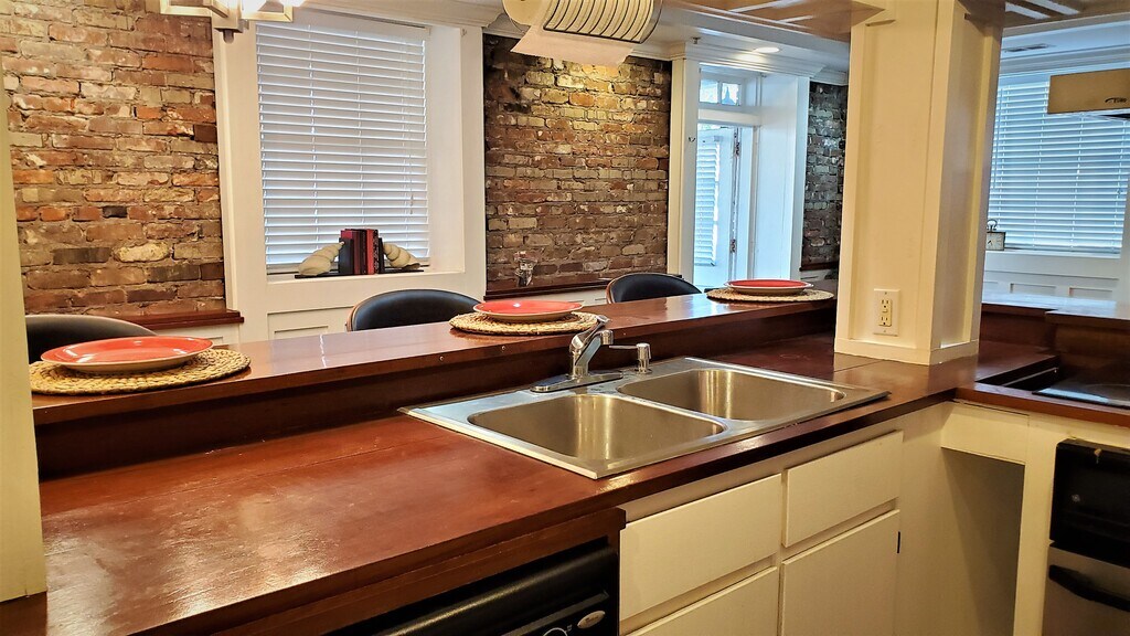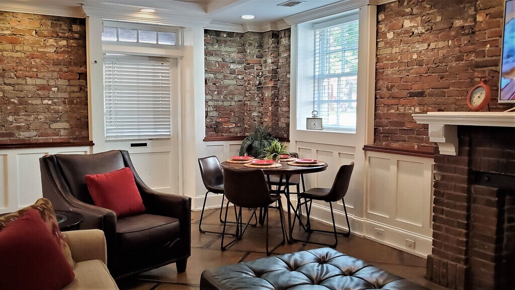 This is a character building near Scad in downtown Savannah. It is in The Residence at the Y. Totally safe park of town near the Oglethorpe House. The building was originally built in 1923 to house the local YWCA. Although it has been renovated, it has maintained the original charm. This unique space is a ground floor unit with private entrance that has original brick floor, a non working fireplace. A large kitchen, bar area. We own a furniture store, so this unit is available furnished or unfurnished. Two full bedrooms and two full bath rooms. Washer Dryer in unit. Sublease available beginning on Mar 1. Shorter term lease is available, but price may vary with length of lease. We can provide it furnished if you prefer. You can go to our website to see how we furnish our other properties. (Cable and utilities are not included. but may be added. We can keep the utilities in our name for an additional fee). Trash and water are included. Price will vary depending upon length of stay, furnishings and amenities
