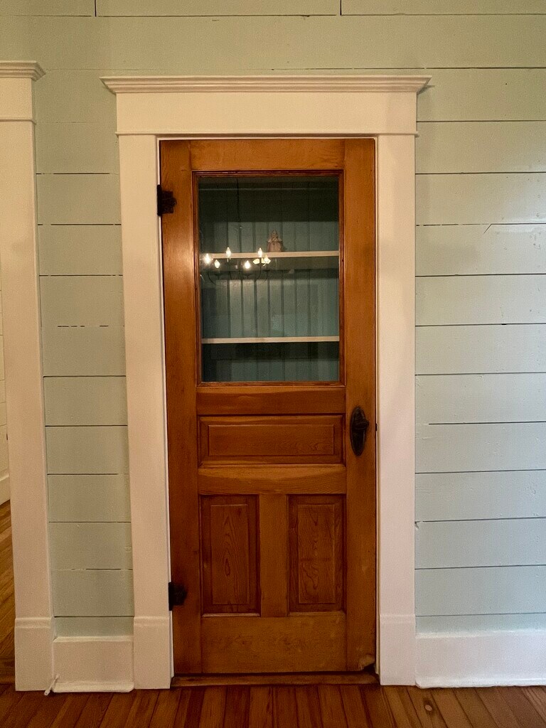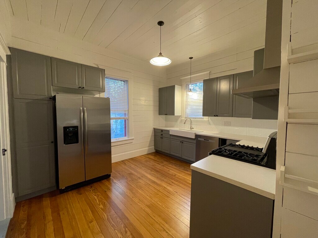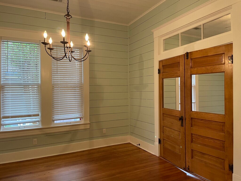Built in the 1920s, the present owners purchased this cottage after their long-time neighbor moved on. She had owned it for 50 years and painted it pink. Now fully remodeled, this two-bedroom, one-bath bungalow features large rooms with the bedrooms on one side of the house sharing a large closet. The living room, dining room and kitchen are on the opposite side. All the rooms feature shiplap paneling, and most rooms are newly painted in a soft pistachio. The original double-hung windows were restored and insulated. Each is trimmed with original window trim, painted white. All the main rooms feature their original long-leaf pine flooring, professionally restored. The ceilings throughout the cottage are over 10 feet tall, and several rooms feature ceiling fans. This house features refinished fir wood doors, four of which include original glass panels. Two of the doors feature glass transoms, and the front door is original with a wooden bow detail. The living and dining rooms open to each other, offering a flexible space for gathering. The dining room offers an original china cabinet accented with Tiffany Blue painted beadboard. The kitchen was completely remodeled, and the cabinets are a medium gray. The backsplash is white pressed tin. The stainless gas range features a chimney vent hood. The porcelain apron sink offers a pullout sprayer faucet. The stainless dishwasher is new. The refrigerator is stainless and is a side-by-side model. The kitchen is large enough for a small table and features a mounted antique pot rack. The bathroom features its original clawfoot bathtub with a chrome British Telephone-Style faucet. There is a white pedestal white along with a freestanding vintage cabinet that came with the house. The white hexagonal floor tile adds to the nostalgic appeal of this home. The front of the house features a large porch with a porch swing. The back porch overlooks the back yard. The house sits on a large lot that was landscaped by the pink-loving former owner, and the majority of the flowers are pink. There is no enclosing fence. The house has been outfitted with AT&T Fiber. The owner pays for Internet, lawn care and pest control.