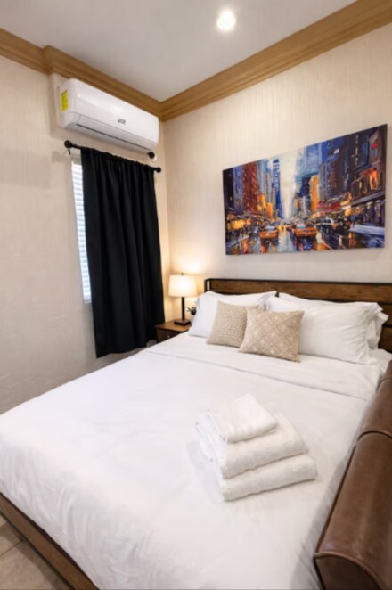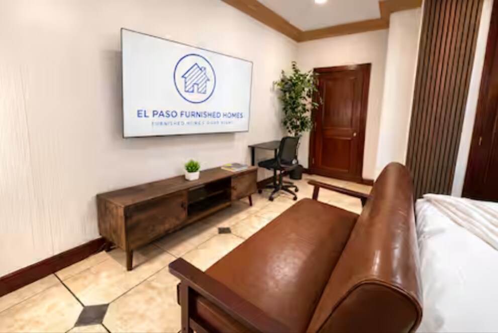 Comfortable and functional studio designed for extended stays. Features a queen-size bed with a 12” mattress, work desk with chair, small sofa, and a 50” 4K TV. The kitchen includes a gas stove, refrigerator, dining table for two, and comes fully equipped with cookware and essentials to prepare home-cooked meals. A private stackable washer and dryer is conveniently located in the kitchen for your exclusive use. The bathroom includes a shower with hot water Welcome to another quality stay by El Paso Furnished Homes — proudly managing over 40+ furnished units across the city. This thoughtfully designed studio is ideal for traveling professionals, relocating guests, nurses, contractors, or anyone needing a comfortable longer-term stay. The space features a queen-size bed with a 12” firm mattress for proper support and rest, a dedicated work desk with chair for productivity, a 50” 4K TV for entertainment, and a cozy sofa for relaxing after a long day. The mini-split system allows you to control the temperature to your comfort year-round. The kitchen is fully equipped with a gas stove, refrigerator, microwave, coffee maker, cookware, utensils, and a dining table for two—everything you need to prepare home-cooked meals. A major convenience is the private in-unit stackable washer and dryer, giving you full control over your laundry during extended stays. The bathroom includes a clean shower, modern vanity, and large mirror with good lighting.