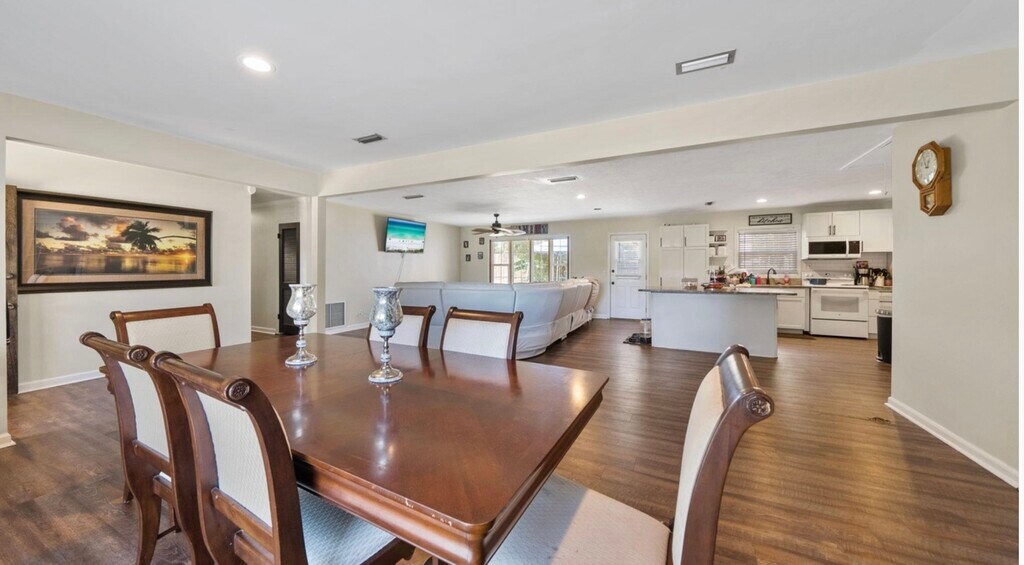 Newly renovated home in nice, quiet neighborhood at dead-end of street and within walking distance of Palm Bay Elementary School. This 5 bedroom 3 full baths will meet your needs as the open floor plan is great for entertaining guests. The mud room has extra storage and a sink and washer and dryer included in the home. Large front yard and fenced in back yard. Yard maintenance is tenant's responsibility. Water and sewage included. Home is set up as a duplex but not connected to the other home. The backyard is shared and there is a privacy fence between both homes. Driveway and covered carport is also a shared space.